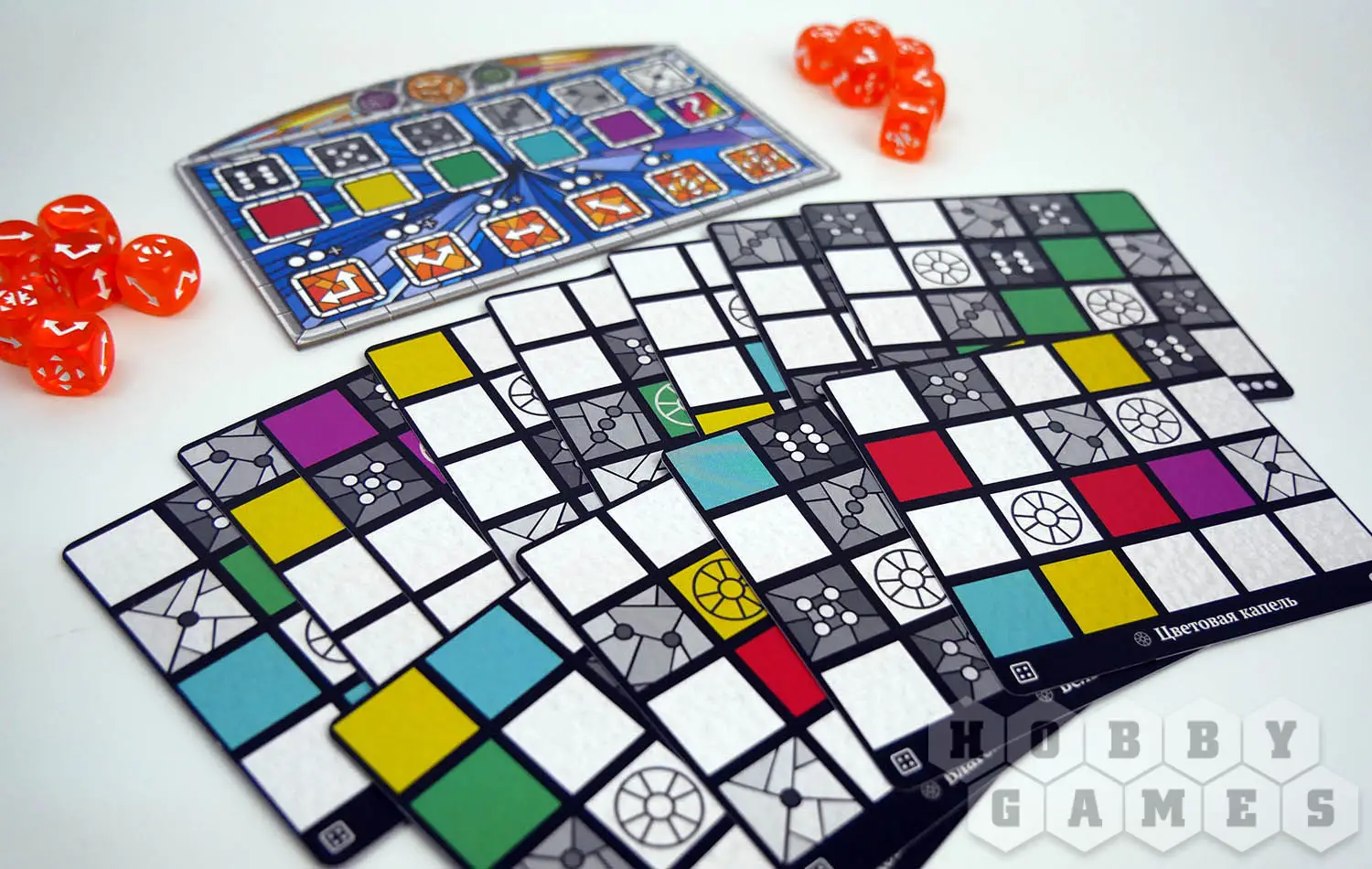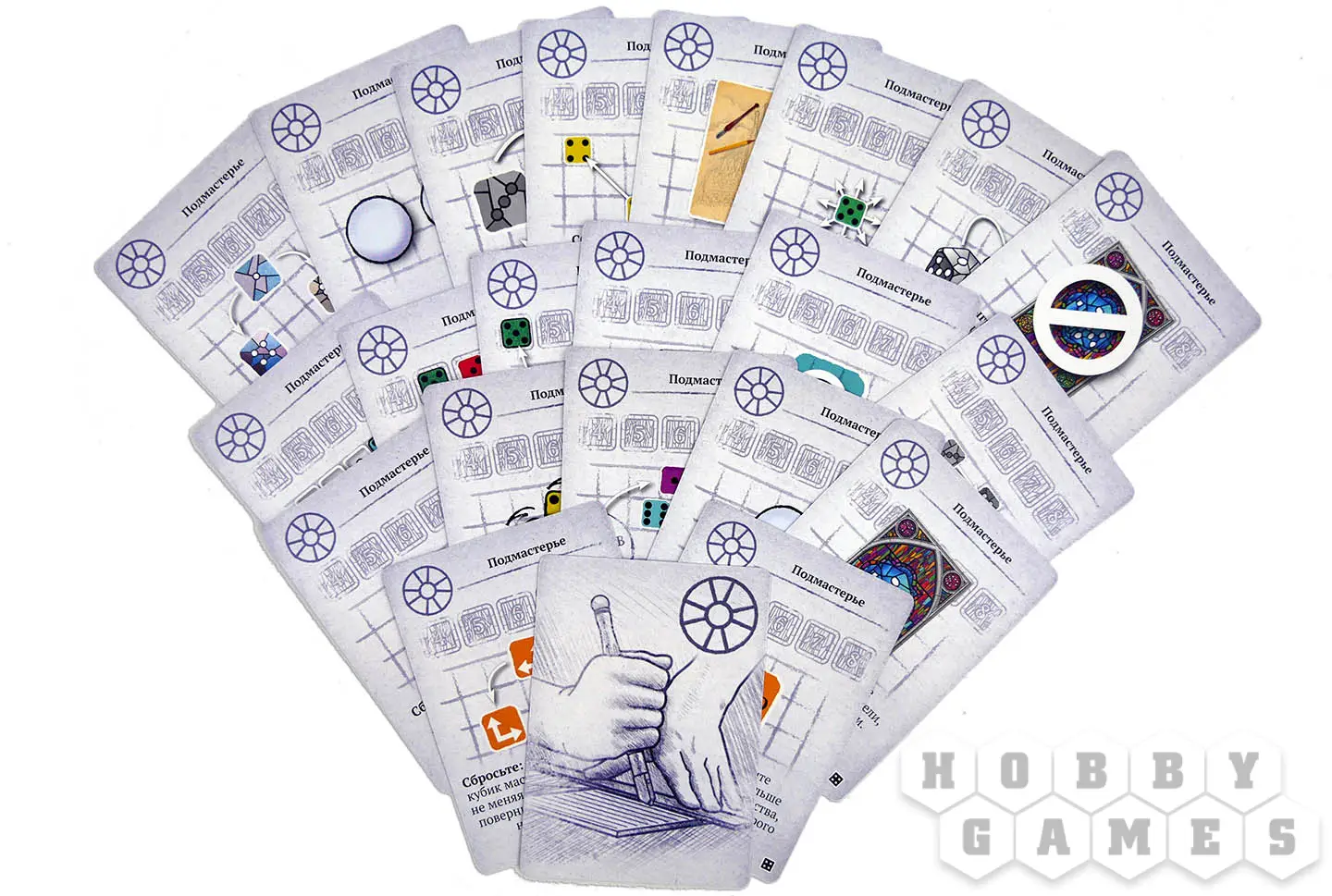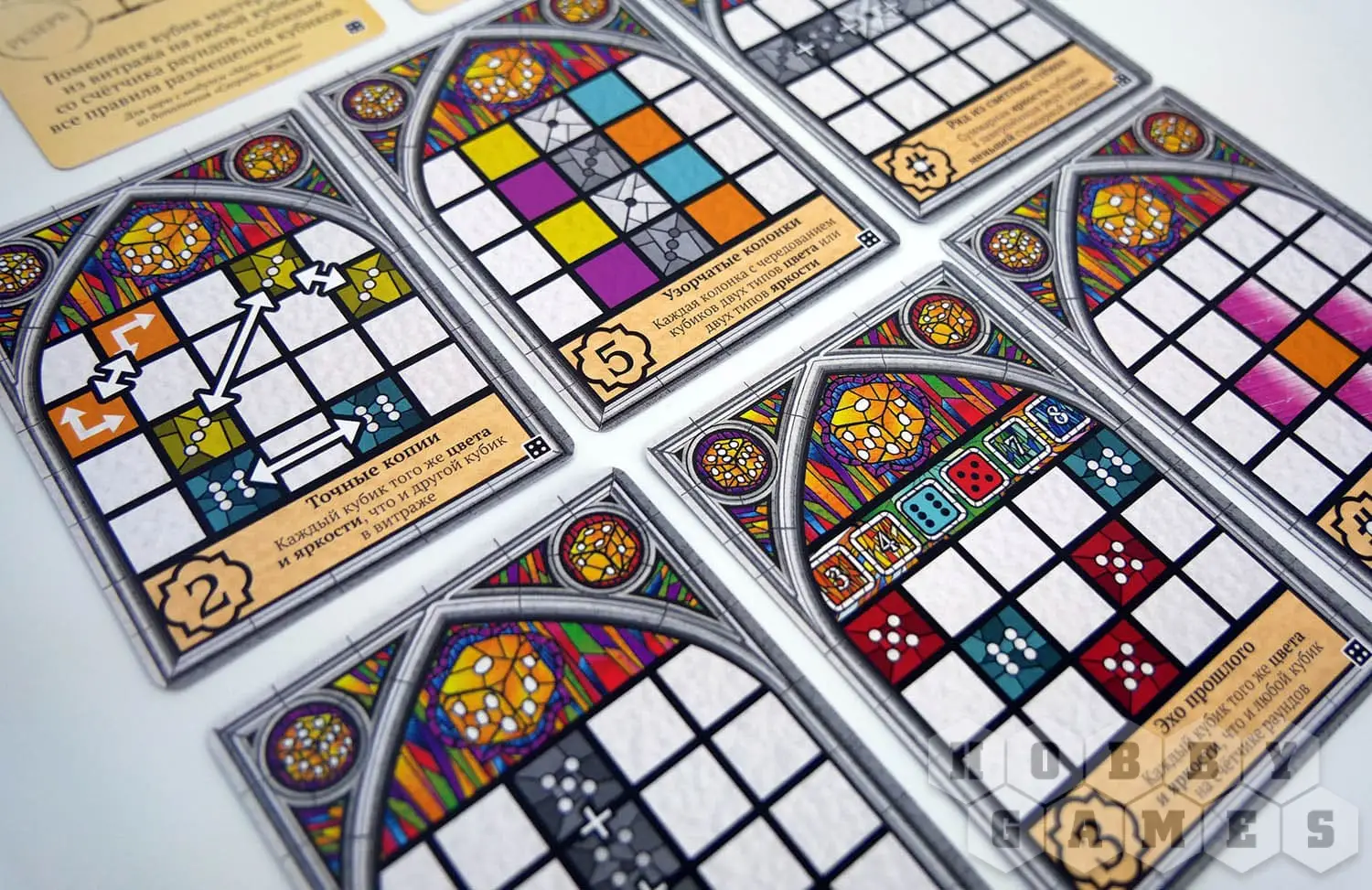 Новые витражи и карты подмастерья. Теперь на некоторых ячейках витражей расположены специальные символы. Если накрыть такой символ кубиком, вы получите карту подмастерья – уникальный бонус, который можно активировать в любой момент игры или при её завершении.
