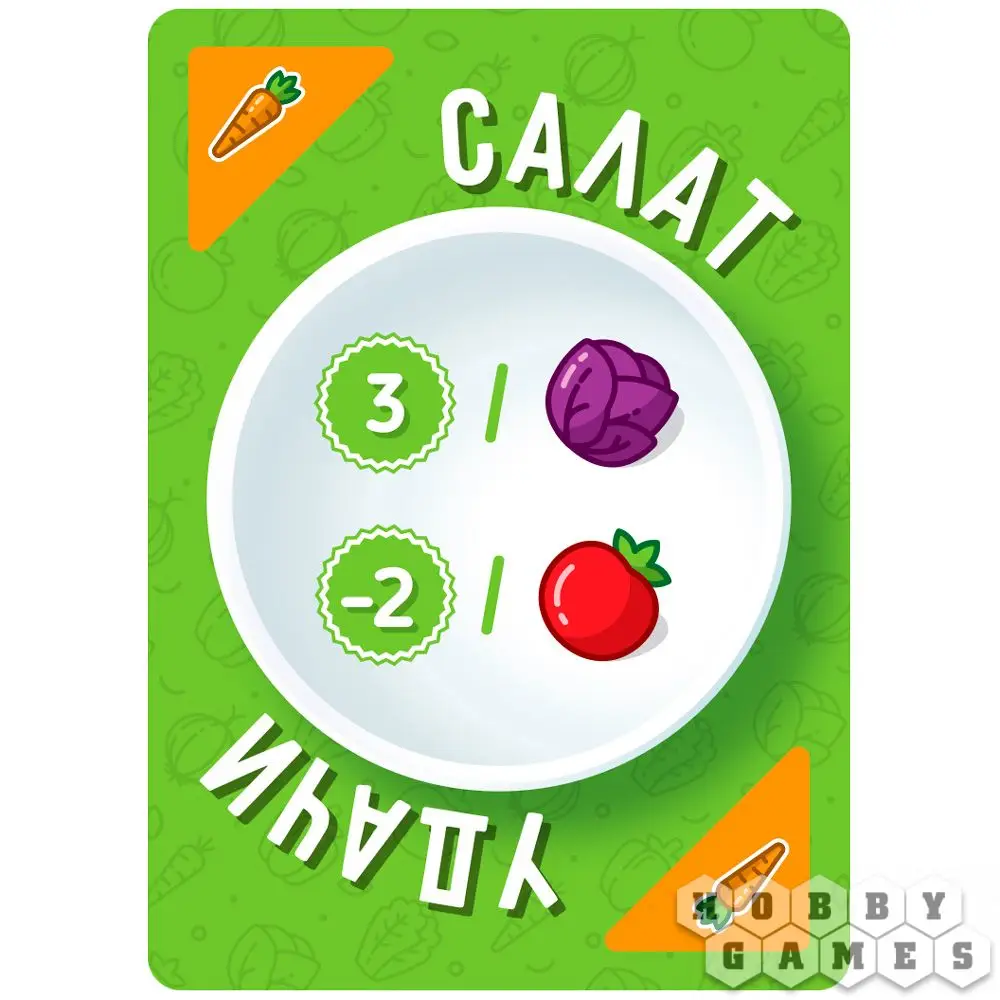 Собственно говоря, всё, с чем вам придётся иметь дело в ходе игры – двухсторонние карты. С одной стороны изображён один из шести видов овощей, а с другой стороны – рецепт, который одновременно является условием получения определённого количества победных очков. Для определённого числа игроков размер общей игровой колоды может варьироваться, а сам игровой процесс – осуществляться в несколько раундов. В этом случае вы сможете в полной мере ощутить динамичный формат и отыграть всю колоду целиком.