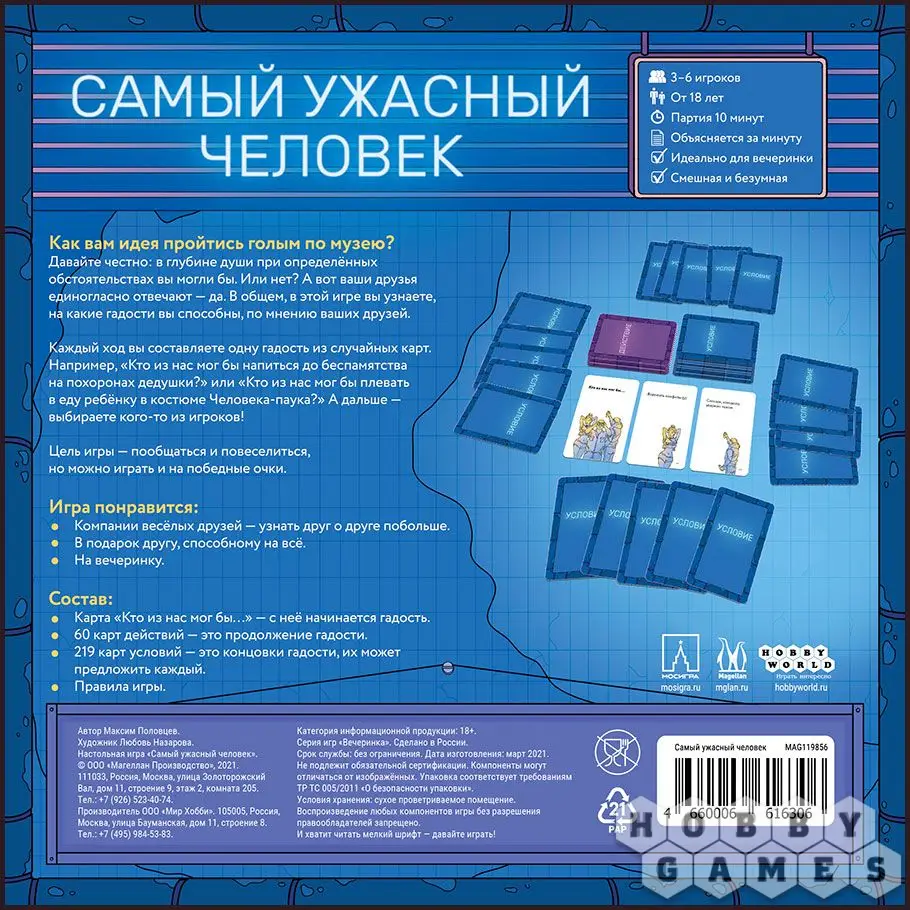 Насколько хорошо вы знаете своих друзей? А они вас? В настольной игре "Самый ужасный человек" участникам предлагается сознаться во всех тайных желаниях и проверить крепкие узы дружбы! Цель игры – общение, веселье и воображение. Каждый ход необходимо комбинировать карты, составляя нелепую гадость и затем выбирать игрока, который по вашему мнению смог бы совершить подобное. Например, пройтись голым по выставочному пространству или же в костюме супергероя испортить ребёнку мороженое!