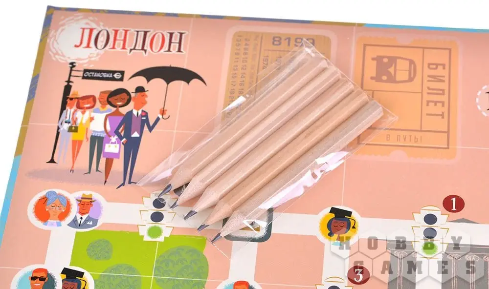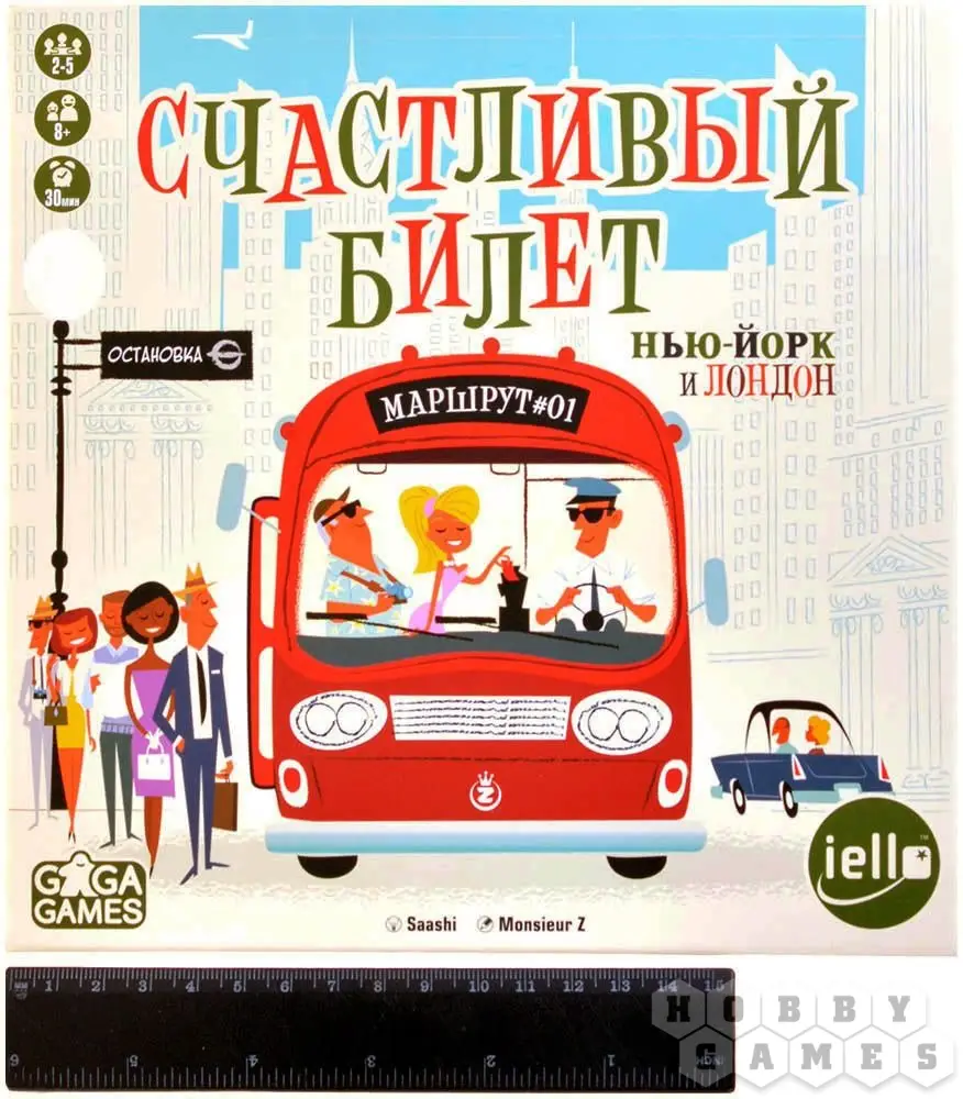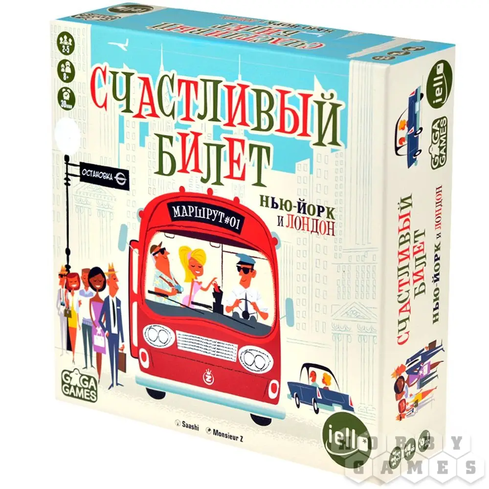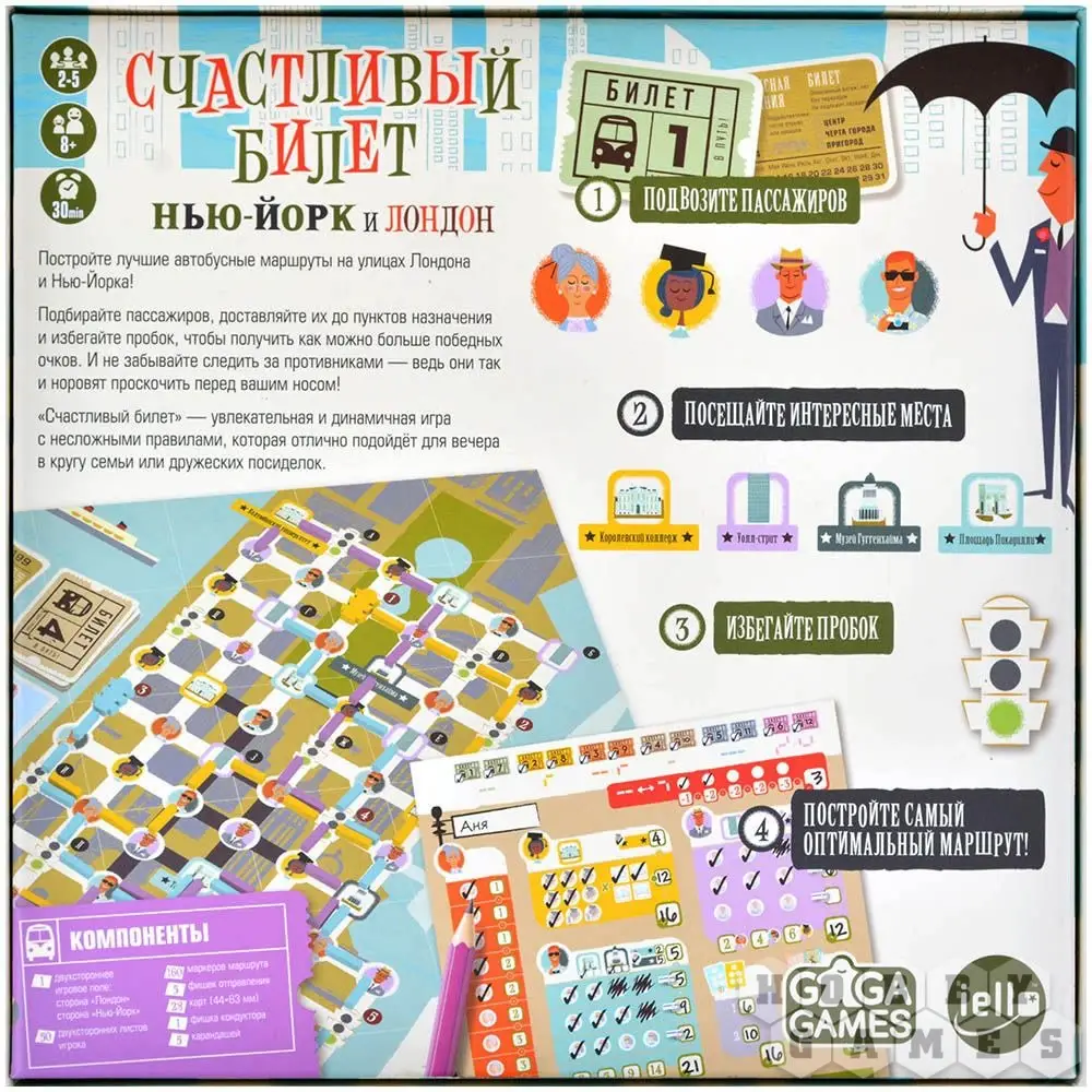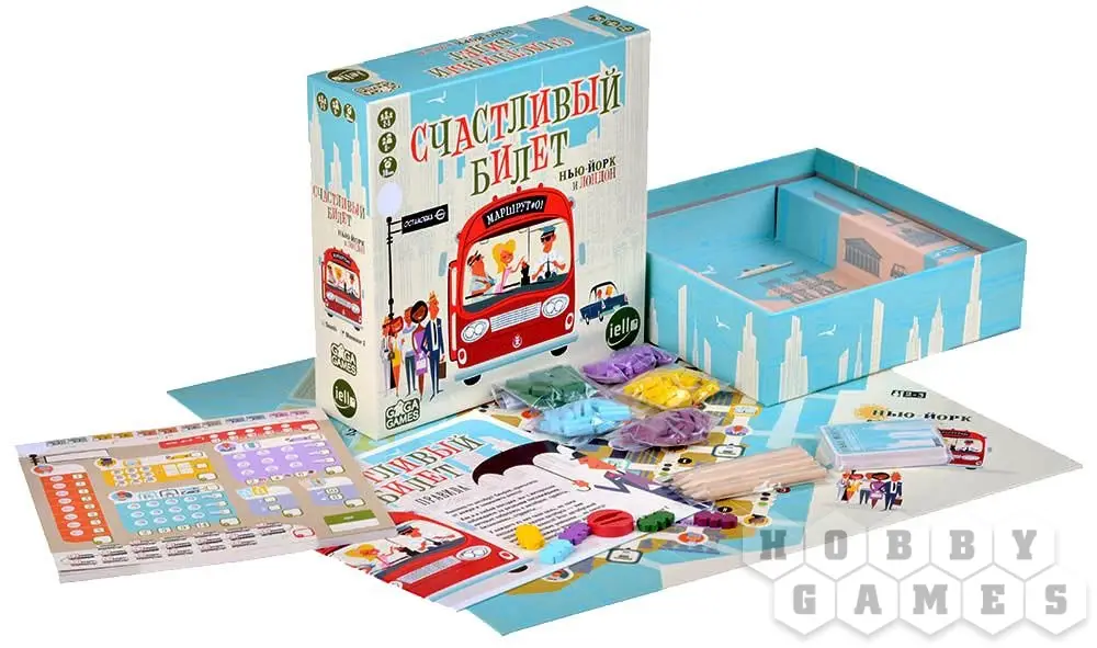 В игре "Счастливый билет" именно этим вы и будете заниматься – при помощи маркеров вам придётся прокладывать маршруты общественного транспорта. Игроки будут соревноваться, пытаясь обходить пробки, набирая пассажиров (но не забывайте, что количество мест ограничено!) и разъезжая по городу. Каждый игрок обладает личной целью: своеобразным путевым листом, на котором указано, какие три точки города он должен соединить своим маршрутом. А городов в игре при этом целых два – вы можете играть как в Нью-Йорке, так и в Лондоне!