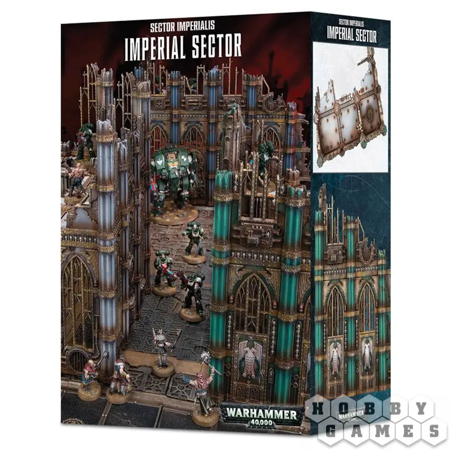Руины Сектора Империалис представляют собой набор из 4 разделов, призванных вернуться в город, разрушенный жестокой войной. Это то, что осталось от великолепной, возвышающейся готической архитектуры - высокие оконные арки, рифленые колонны и множество черепов, украшающих стены, вентиляционные отверстия, воздухообрабатывающие агрегаты и трубопроводы, придающие комплексу привычное индустриальное чувство. Каждая секция пола развалин спроектирована так, чтобы оставлять много места для игр в больших миниатюрах, которые легко вписываются внутрь. Все арматуры имеют те же размеры, что и в Секторе Механикус, что означает, что их добавление к существующему пейзажу будет простым.