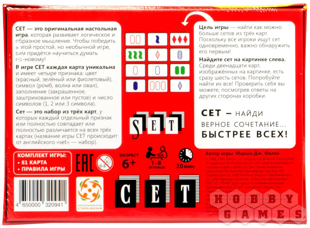 "Сет" – это оригинальная настольная игра, которая развивает логическое и образное мышление. Чтобы победить в этой простой, но необычной игре, вам придется научиться думать по-новому!