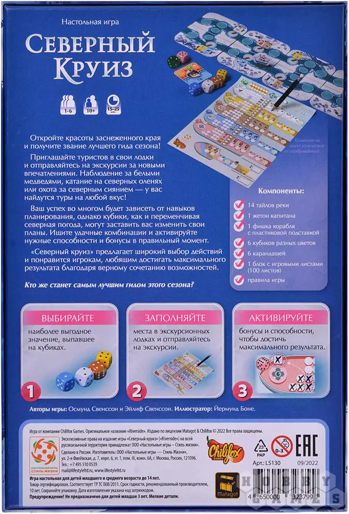 "Северный круиз" – игра с механикой Roll'n'Write, то есть вам предстоит бросать кубики и, в зависимости от выпавших значений, прокладывать наиболее оптимальные маршруты на вашем личном листе. Только в отличие от других игр с данной механикой, тут вас ждёт модульное игровое поле, которое перед началом игры вы составляете как душе угодно. Это многократно повышает реиграбельность, поэтому ни одна партия не будет похожа на другую. А простые правила и количество игроков от 1 до 6 позволят сыграть в игру любым составом в любое время.