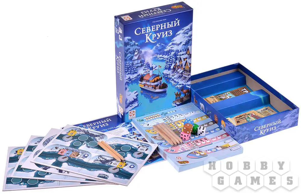 В настольной игре "Северной круиз" вам предстоит стать гидами на корабле, отправившемся в круиз по холодным краям. Покажите вашим туристам все прелести зимнего отдыха в этих краях: успейте показать им прекрасное северное сияние, дайте возможность попробовать подлёдную рыбалку и обязательно прокатите их на оленьей упряжке!