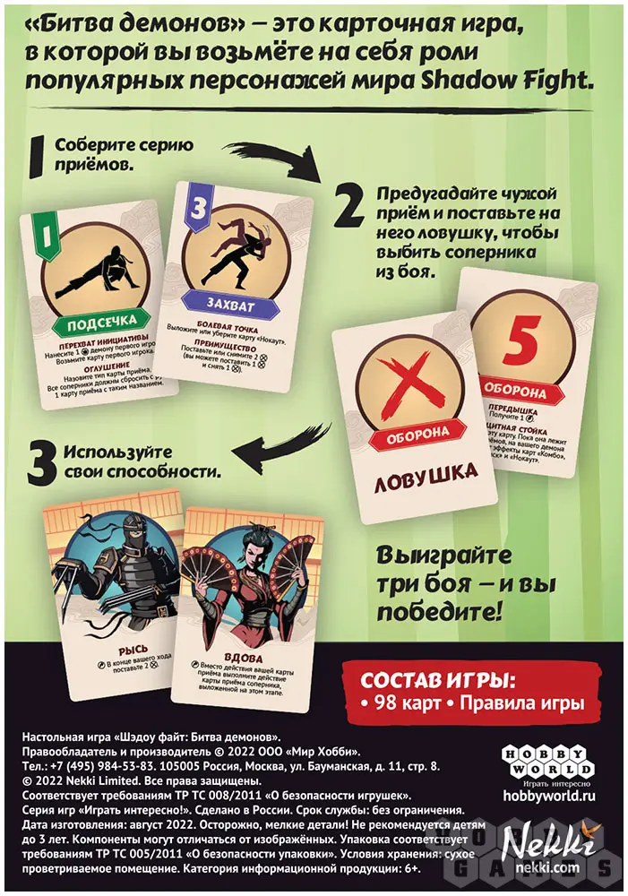"Битва демонов" – это динамичная карточная настолка, созданная по мотивам популярной мобильной игры Shadow Fight. Взяв на себя роль одного из персонажей (возможно, даже уже знакомого), вам предстоит одолеть всех своих соперников. Для достижения данной цели у вас есть целый арсенал приёмов, различные комбо, ловушки и уникальная способность собственного демона. Одержите ряд побед, чтобы стать полноправным наследником грозного Титана.