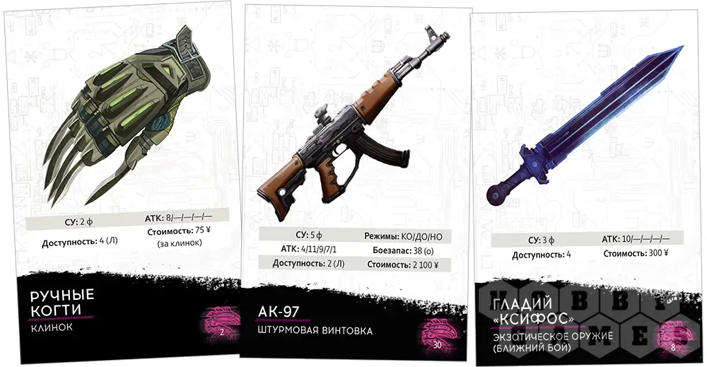В наборе вы найдёте 55 карт оружия: здесь вам и огнестрел, и холодное оружие, а также краткая справка по модификациям (ведь нет ничего круче, чем прокачать любимый ствол!). Вне зависимости от того, каковы ваши предпочтения и задача, а также являетесь вы игроком или мастером, эта оружейная колода облегчит игровой процесс. Нужные правила всегда под рукой!
