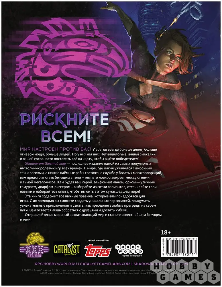 Перед вами основная книга правил по настольной ролевой игре "Shadowrun: Шестой мир". Шестой мир – это загадочная и волшебная вселенная, в которой причудливо переплетаются магия и высокие технологии, а мегакорпорации готовы пойти на всё ради дополнительной выгоды, выжимая из своих рабов последние соки. Игрокам предстоит взять на себя роль тех, кто не хочет вписываться в этот мир и выбирать между сияющими огнями небоскрёбов и вязкой тьмой бараков и общежитий. Уж лучше уйти в тень, бросить вызов этому обществу и использовать его слабости ради своей пользы.