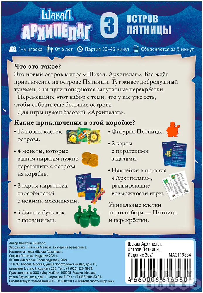 Также вас ждёт новый персонаж – небезызвестный Пятница. Плюс к этому вы найдёте дополнительные карты пиратских способностей, и, конечно же, наклейку для книжки основных правил Архипелага, которая добавит игре новых возможностей. Йо-хо-хо!