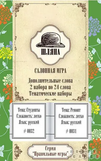 Примерно такие слова есть на карточках этого набора для игры «Шляпа». Одна карточка - шесть слов для объяснения словами, жестами или рисованием. Без базовой версии карточки не играются, поэтому вам нужна оригинальная коробка, если вы хотите приобрести это дополнение. В данном наборе используются слова, связанные одной темой, например, по биологии или литературе.