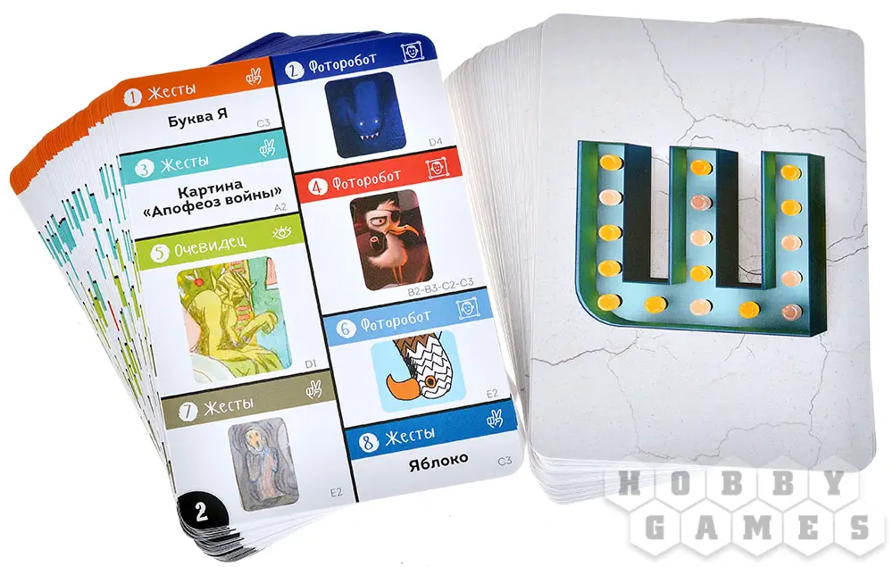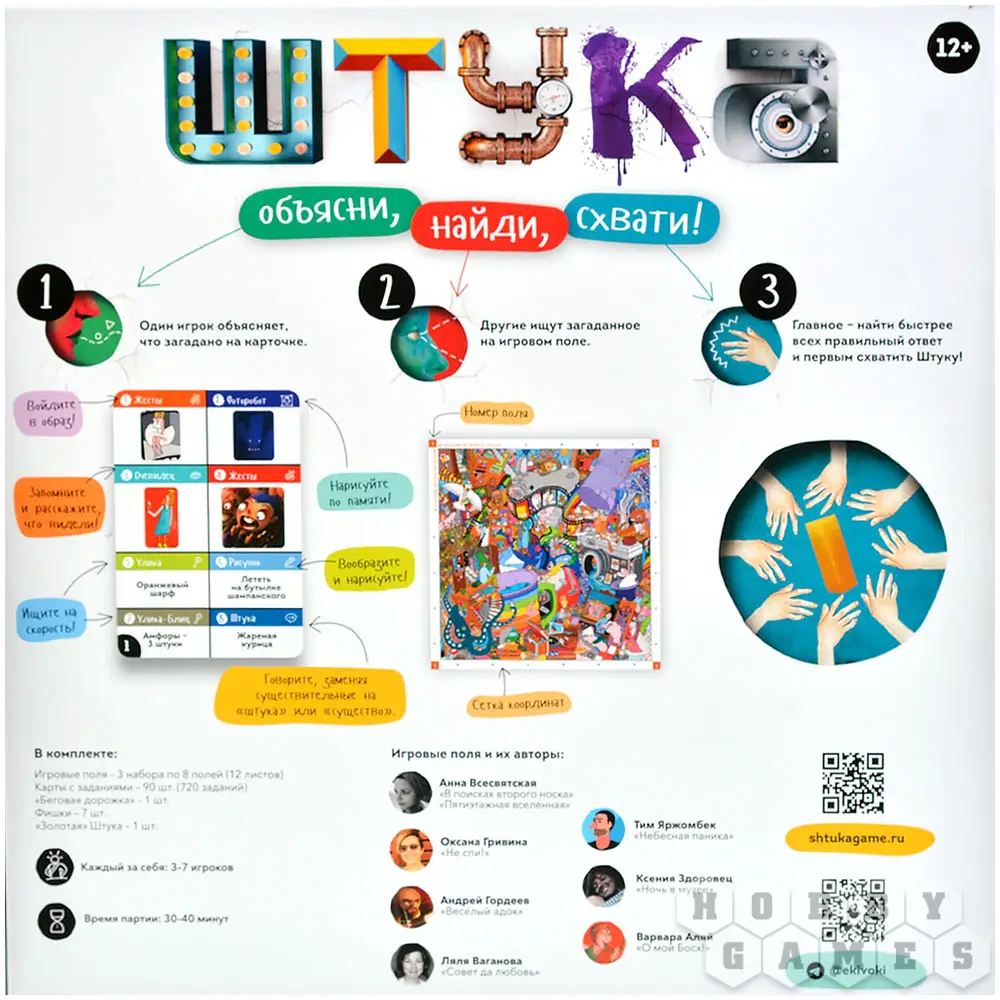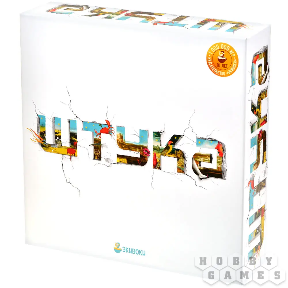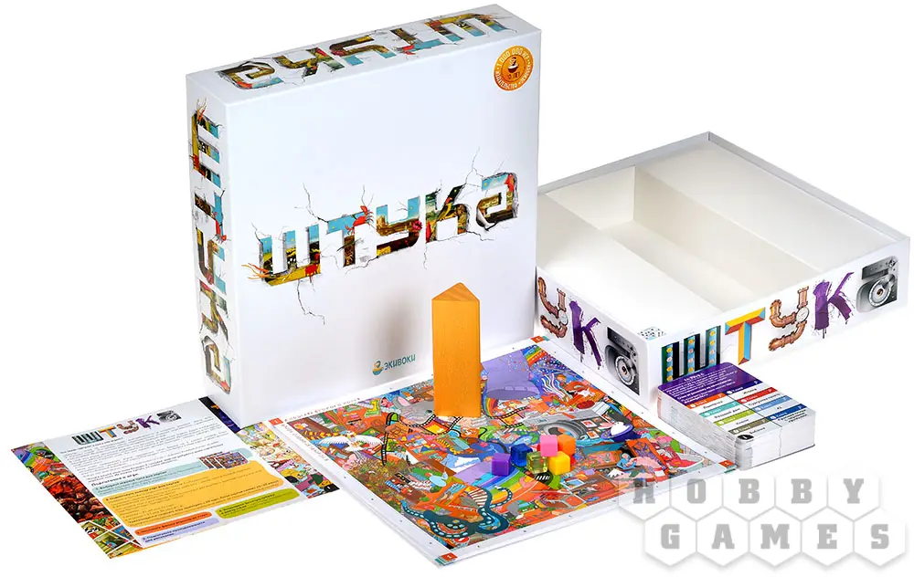 "Штука" – это настольная игра на внимание и ловкость формата "объясни-покажи". Один игрок, ведущий, будет тем или иным способом (словами, рисунком, жестами и т.д.) объяснять слово с карточки задания. Остальные же должны на скорость понять, о чём идёт речь, а затем найти загаданный предмет на игровом поле – завораживающих композициях, с любовью созданных художниками и иллюстраторами. Не забудьте сперва схватить золотую Штуку – это даст вам право ответить, а также подтвердит, что вы были быстрее своих соперников. Если вы дали правильный ответ, продвиньтесь по "беговой дорожке" для фишек вперёд, а если ошиблись, вернитесь назад – в наказание за свою нетерпеливость и поспешность!