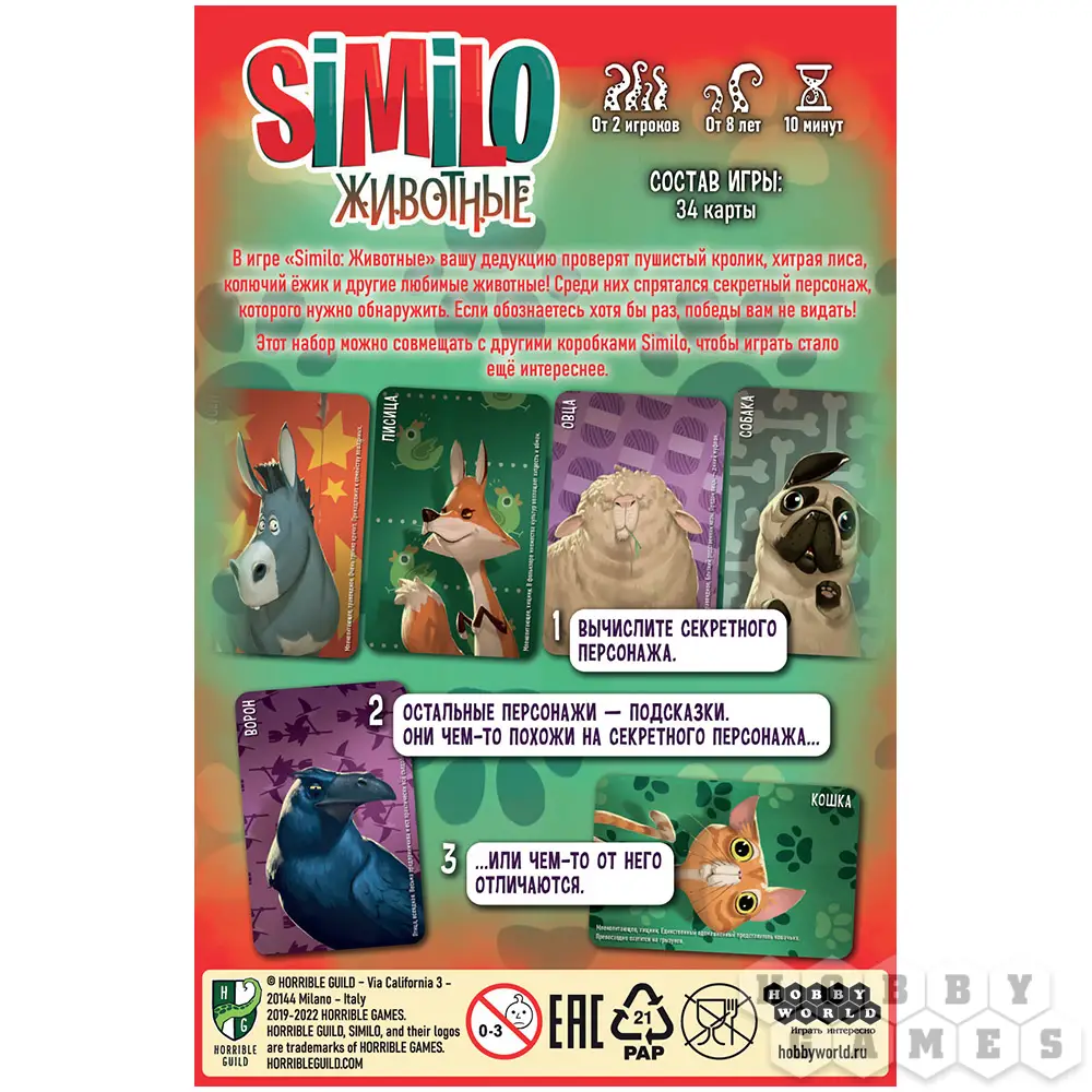 "Similo: Животные" – это кооперативная игра, в ней вам нужно действовать совместно – вместе же вы выиграете или проиграете. Вы победите, когда на столе не останется ни одной карты, кроме секретной. Но если вы решите выкинуть её – вам тут же засчитается поражение.
