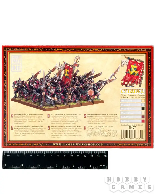 Из 148 пластиковых деталей этого набора можно собрать 20 стормверминов с алебардами: в комплекте 12 вариантов голов (по 2 каждого), щиты пяти видов, разные сборные тела, большое количество оружия, части для создания музыканта, знаменосца и клыка-вожака, квадратные подставки 20х20 мм.