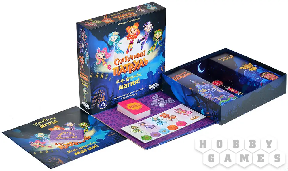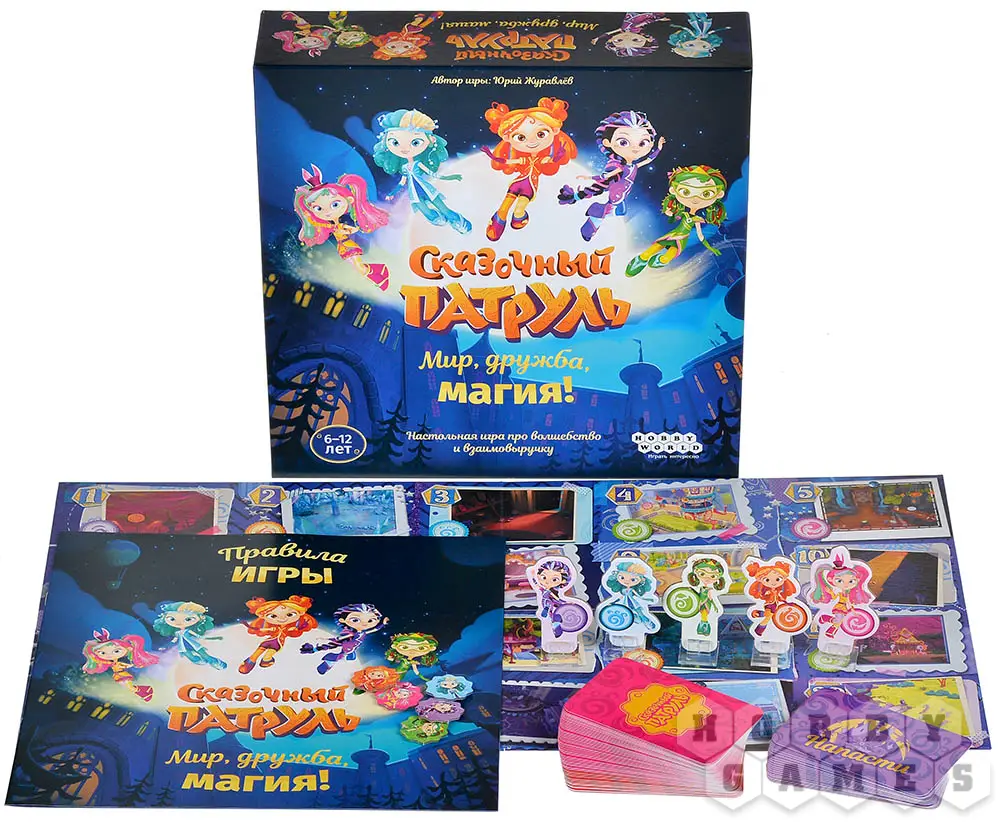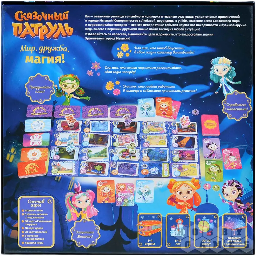 "Сказочный патруль: Мир, дружба, магия!" – это кооперативная настольная игра с атмосферой волшебства, которая сделает ваш досуг с детьми веселее. Играйте вместе, выполняйте цели и миссии, чтобы доказать, что вы – настоящие хранители города. А если вам удастся вовремя выполнить все задачи, то победа точно будет за вами!