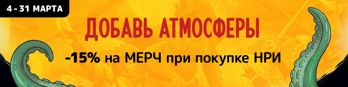 • Положи в корзину хотя бы один товар из специальной подборки НРИ – будь то стартовый набор любимой вселенной, новое приключение, увесистый фолиант или любой другой товар из акционной категории