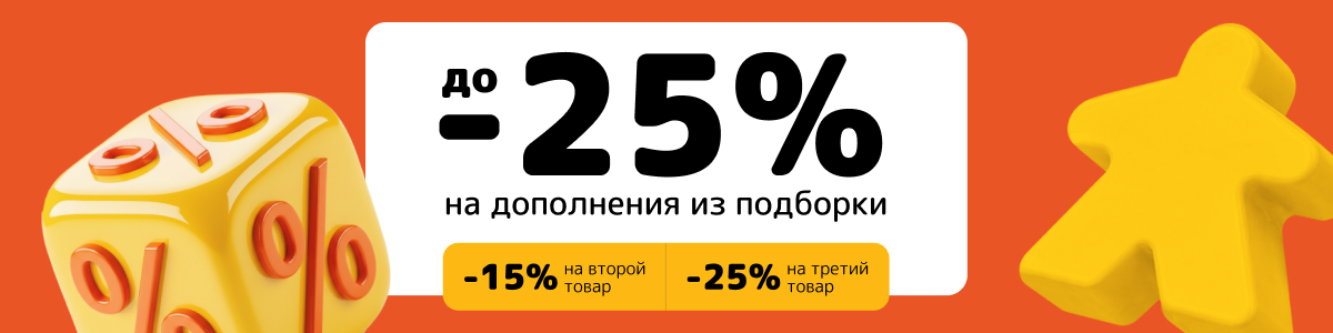 Любая великая игра – это только начало пути. Вы уже виртуозно владеете базовыми механиками и сыграли десятки партий? Самое время открыть для себя новые горизонты любимых вселенных, ведь у нас действует особое предложение на подборку дополнений: чем больше товаров в корзине, тем выше скидка!