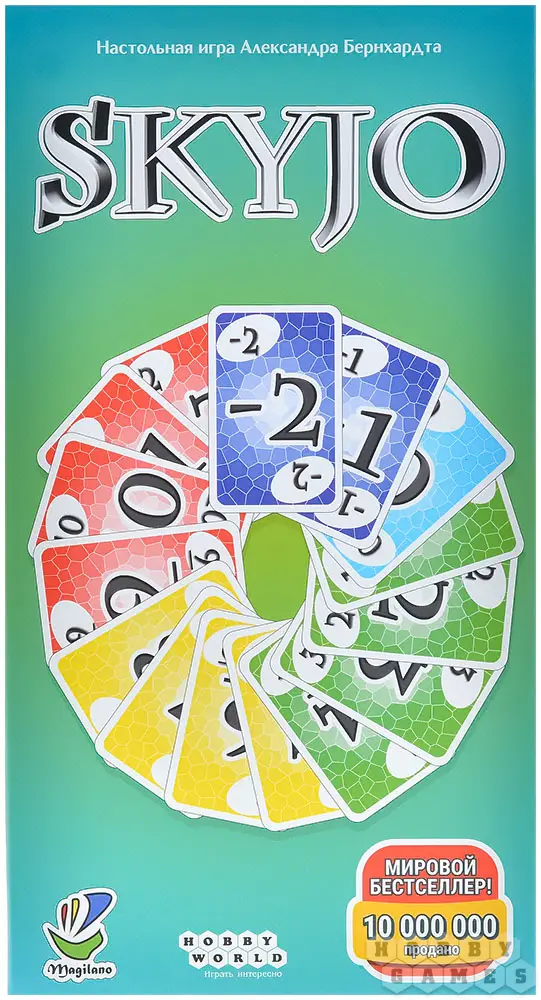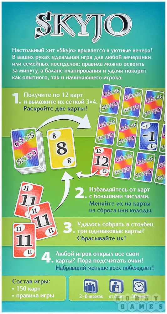 Skyjo – динамичная настольная карточная игра с простыми правилами, которые осваиваются буквально за минуту. При этом в игре удачно сочетаются расчёт и элемент удачи, поэтому она одинаково увлекает и тех, кто только знакомится с настолками, и более опытных игроков.