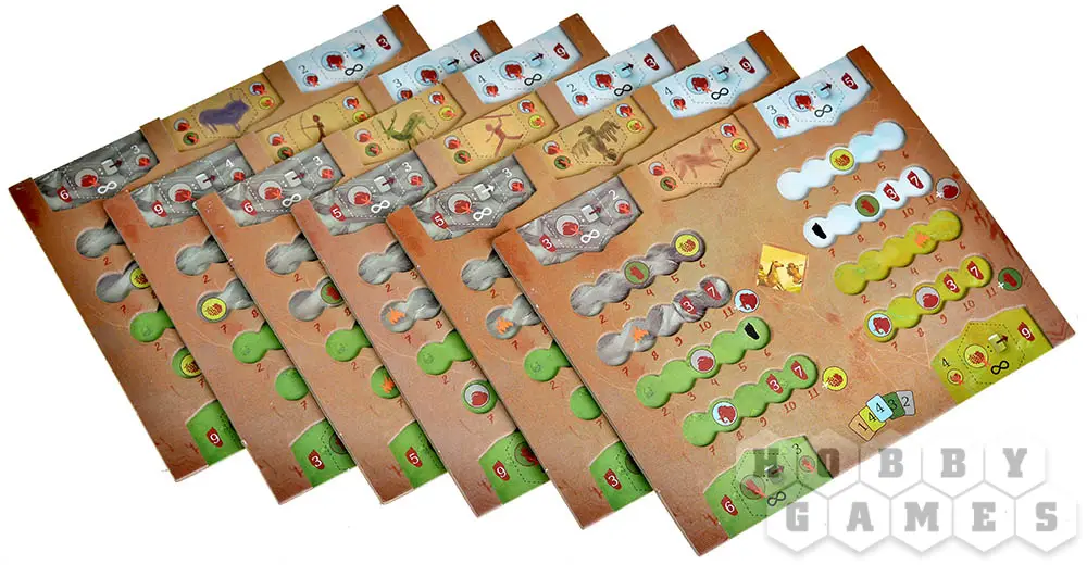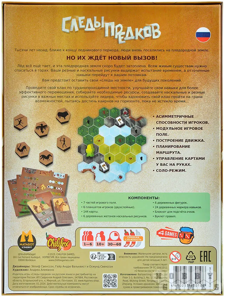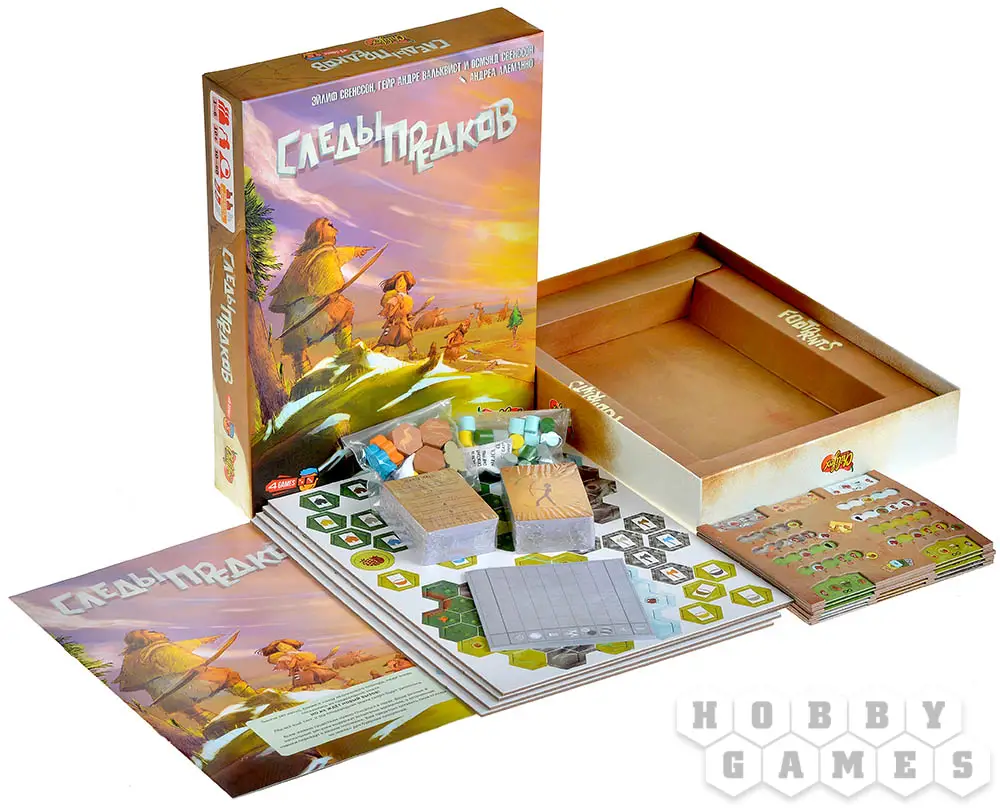 У каждого из вас на руках будут карты клана. Ваша задача – заработать максимально большое количество победных очков и добраться до конечной точки. Чтобы получать очки, вы будете каждый ход разыгрывать одну из своих карт, продвигаясь по полю и улучшая свои ресурсы, навыки и способности. А ещё не забывайте о наскальных рисунках и дополнительных целях, ведь они тоже могут помочь вам вырваться вперёд. Сможете ли вы пережить потоп и оставить своё послание потомкам?