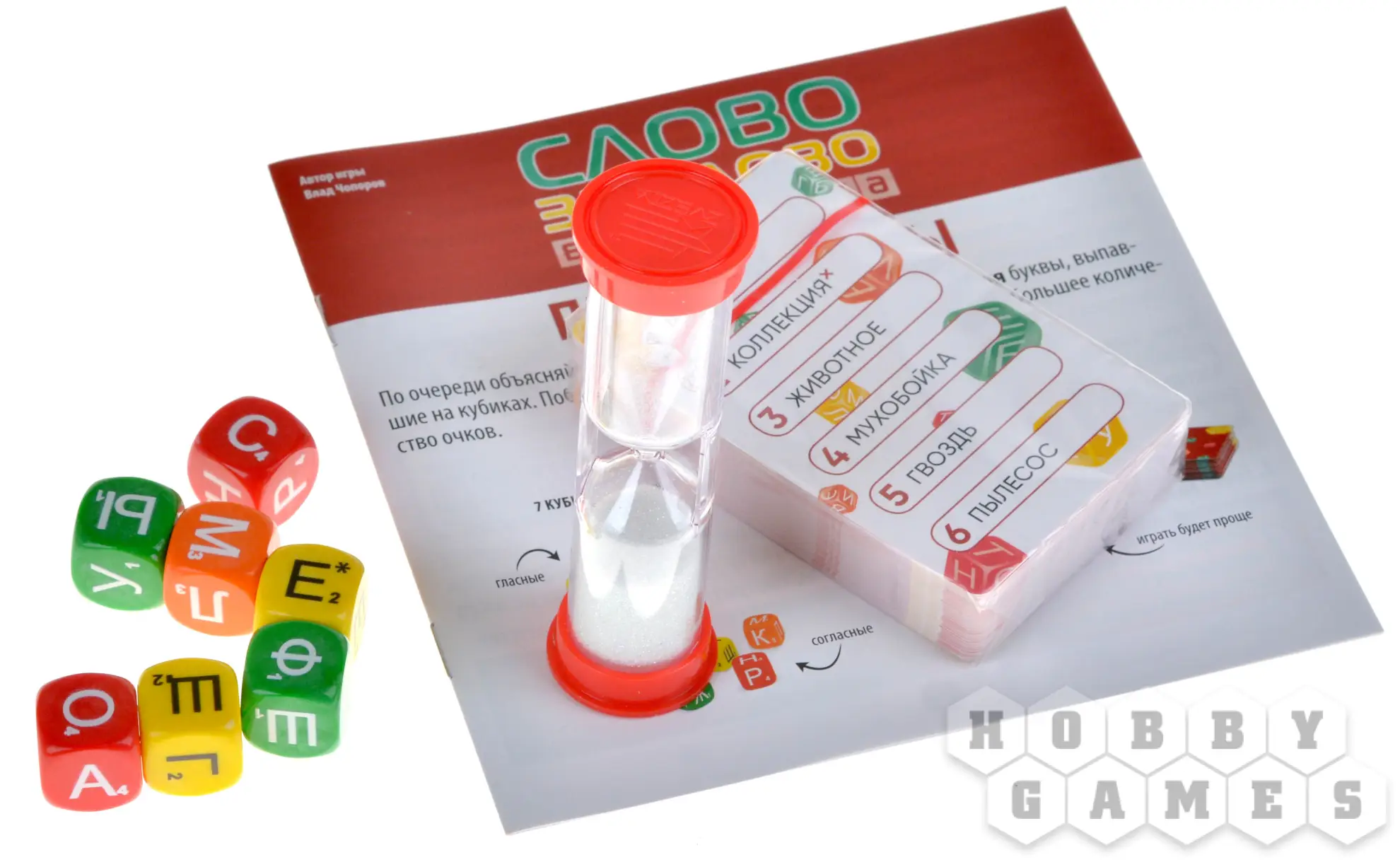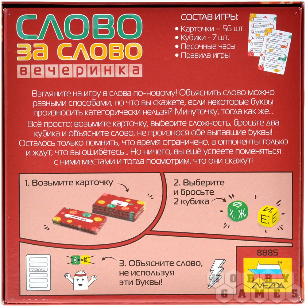 Выберите, на каком уровне сложности вы хотите играть, возьмите соответствующую колоду карт слов и перемешайте. Разделитесь на 2 команды и начинайте игру! Задача проста – объяснить своей команде слово за отведённое время, – но осложняется она тем, что вам нельзя будет использовать определённые буквы. Какие буквы окажутся под запретом, решает бросок кубиков. Справились с задачей? Получите очки в количестве, указанном на кубиках с буквами. А если нет, сбросьте карту и передайте ход команде противника.