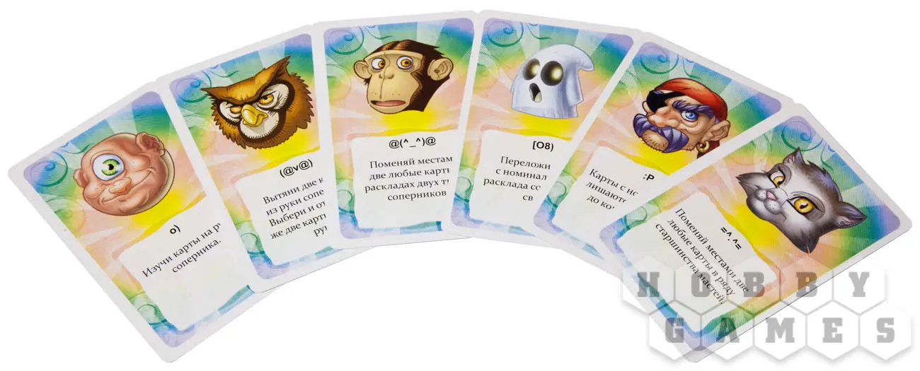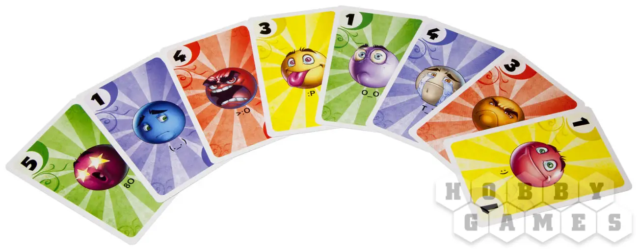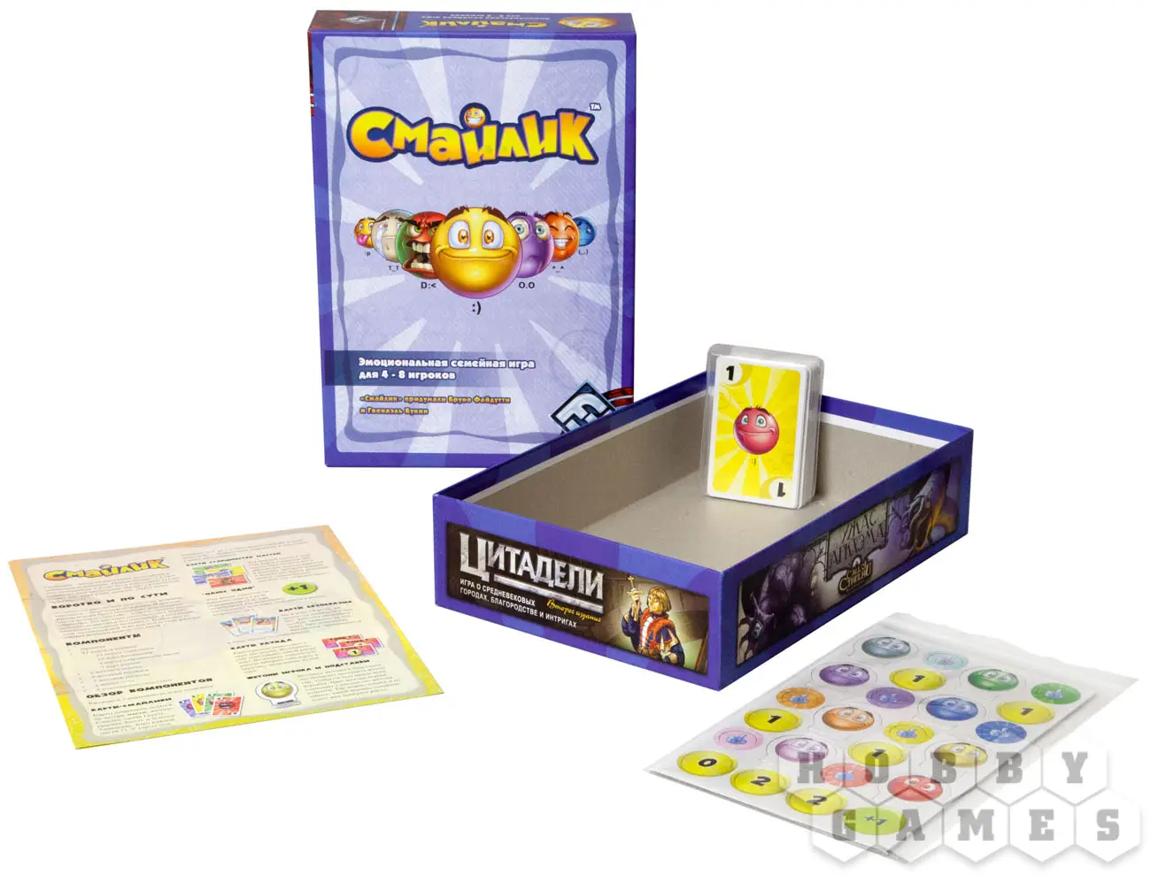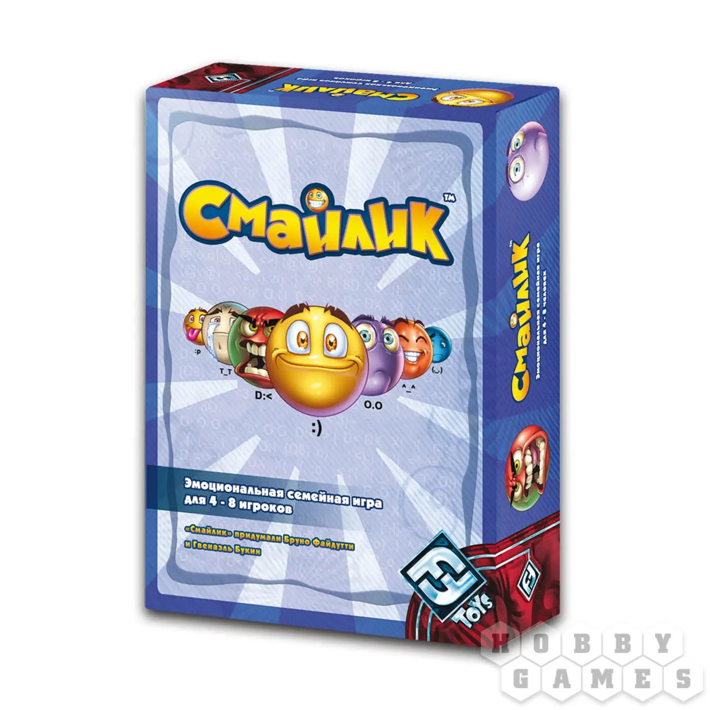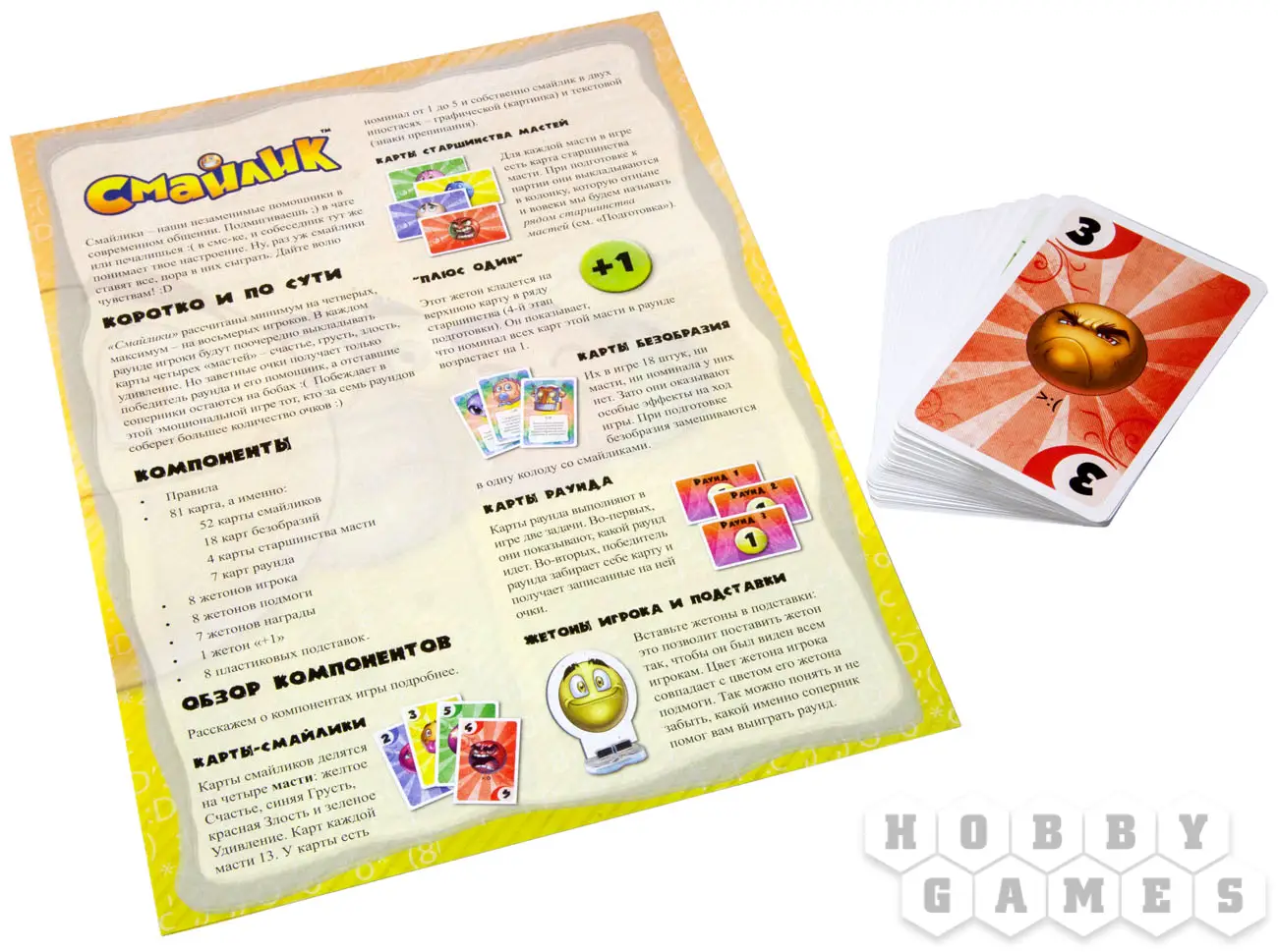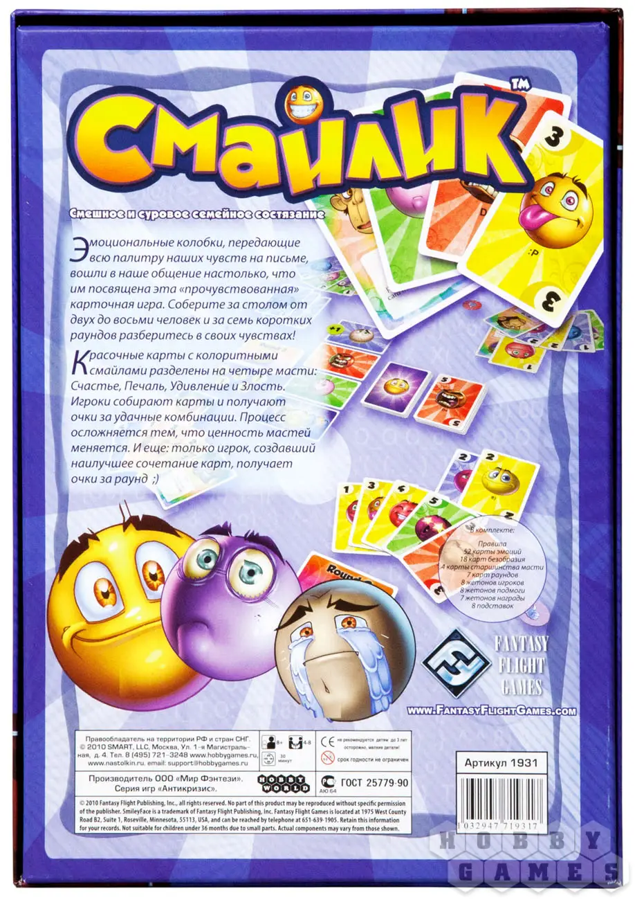 Настольная игра «Смайлики» рассчитаны минимум на четверых, максимум – на восьмерых игроков. В каждом раунде игроки поочерёдно выкладывают карты четырёх мастей – счастья, грусти, злости, удивления. Но заветные очки получают только победитель раунда и его помощник, а отставшие соперники остаются на бобах : ( Чтобы набрать очки, нужно выкладывать самые ценные сеты карт. Побеждает в этой эмоциональное борьбе тот, кто за семь раундов соберёт больше количество очков. ^o^