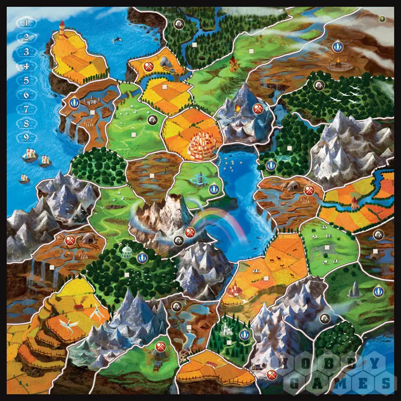 2. Захват регионов — новым народом можно производить захват только с пограничных зон. Для захвата необходимо переместить на пограничный или соседний с вашим регион два ваших жетона народа плюс один дополнительный за каждый жетон чужого народа (а также за жетон гор, крепостей и тд.). Защищающийся игрок понесёт потери, лишившись одного жетона с региона, но в конце вашего хода сможет передислоцировать оставшиеся войска.