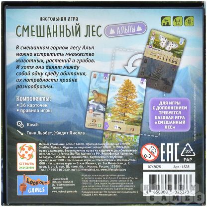 Дополнение обогащает базовую игру "Смешанный лес", привнося более тридцати новых карт с обитателями Альп. Вы познакомитесь с новыми породами деревьев – лиственницей и кедром, а также с уникальными животными, такими как бородач и заяц-беляк. Эти нововведения делают экосистему богаче, не усложняя главную цель игры. Теперь создавать сбалансированные среды обитания стало ещё интереснее.