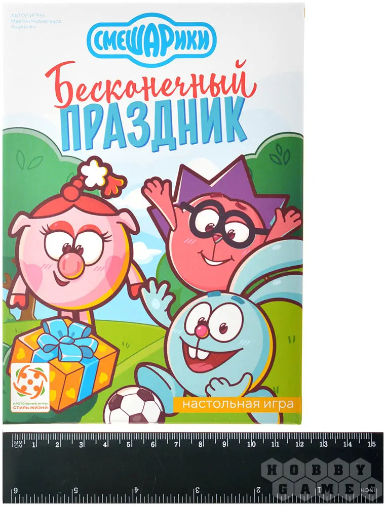 "Смешарики. Бесконечный праздник" – карточная мемори-игра на внимательность и скорость реакции. В центр стола выкладывается колода карт. Игроки внимательно смотрят на верхнюю карту, после чего она переворачивается. Теперь задача участников – как можно быстрее назвать предмет или персонажа, который пропал на обороте карты. В случае правильного ответа игрок получает эту карту в награду.