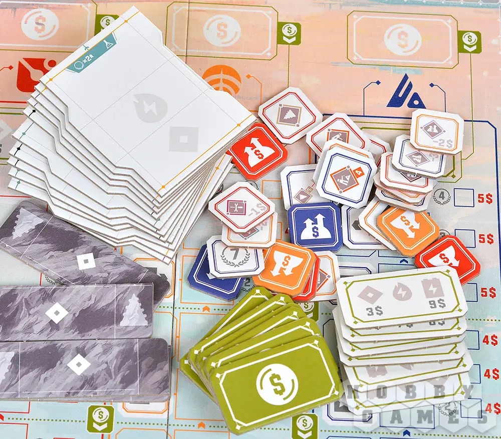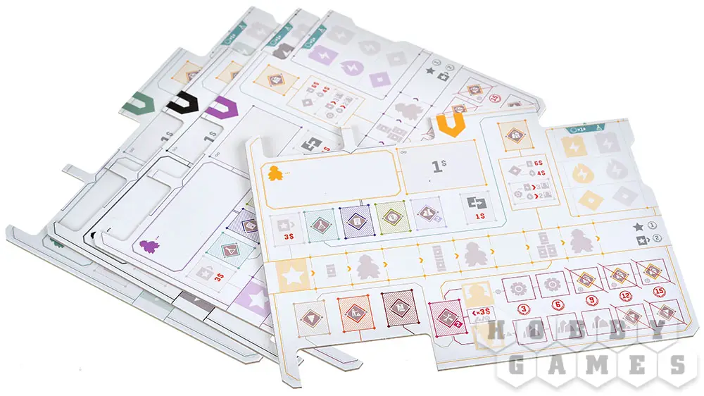 Развитие: Двигайте индикатор развития бизнеса, чтобы открывать новые ячейки склада (переворачивая жетоны склада) и нанимать дополнительных инженеров.