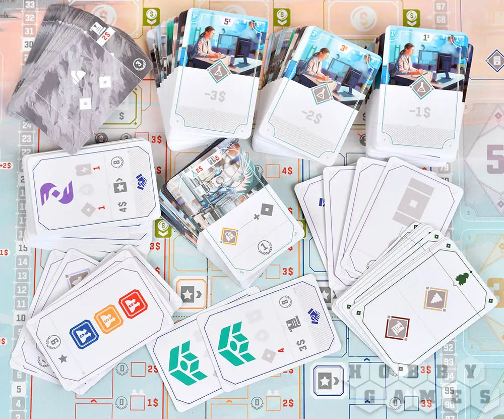 Продажа и контракты: Продавайте продукцию корпорациям, повышая их стоимость акций (передвигая индикаторы стоимости активов), или выполняйте контракты для получения денег, победных очков и акций.