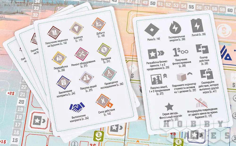 Добыча: Добывайте рапу, когда бур достигнет нужного горизонта. Закрывайте символы рапы фишками истощённых участков и перемещайте фишку рапы на складе.