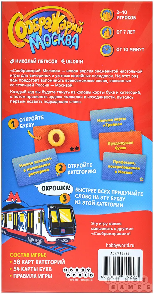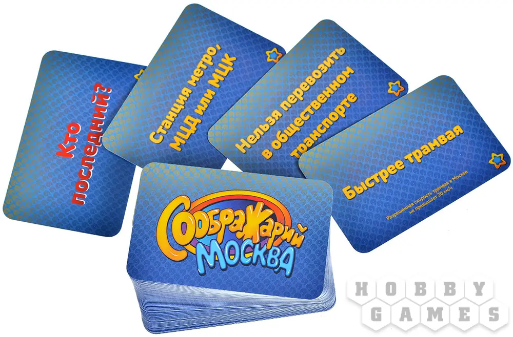 "Соображарий: Москва" – это версия знаменитого хита "Соображарий", которая посвящена столице Российской Федерации. Игра придётся по душе каждому, кто родился в Москве, приехал её покорять или просто хорошо с ней знаком: на кон будет поставлена ваша непосредственная честь как москвича (или москволюбителя). Играть в неё можно вдвоём с другом, но максимум веселья вы получите в большой компании. Только представьте: поворот карты, нервы на пределе, очертания буквы, скрежет шестерёнок в голове, движение губ... кто из вас успеет сказать слово первым? Главное не забывайте – тематика-то московская!