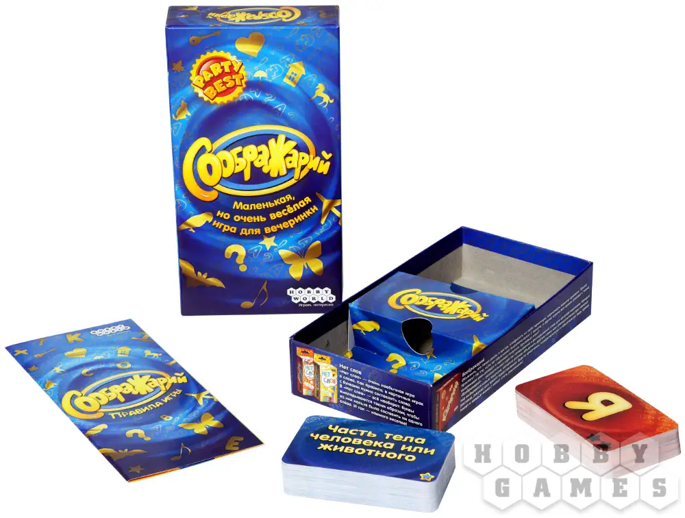 Сколько животных начинающихся на букву "К" вы знаете? Сможете ли за минуту назвать самое длинное слово на букву "Б"? А сколько товаров из супермаркета слов на букву "Ц" вы сможете вспомнить? Настольная игра "Соображарий" заставит вас задуматься! Она прекрасно подойдёт для шумных вечеринок или тихих семейных вечеров. Развивайте свой кругозор, вспоминайте самые неординарные слова и победа будет в вашем кармане.