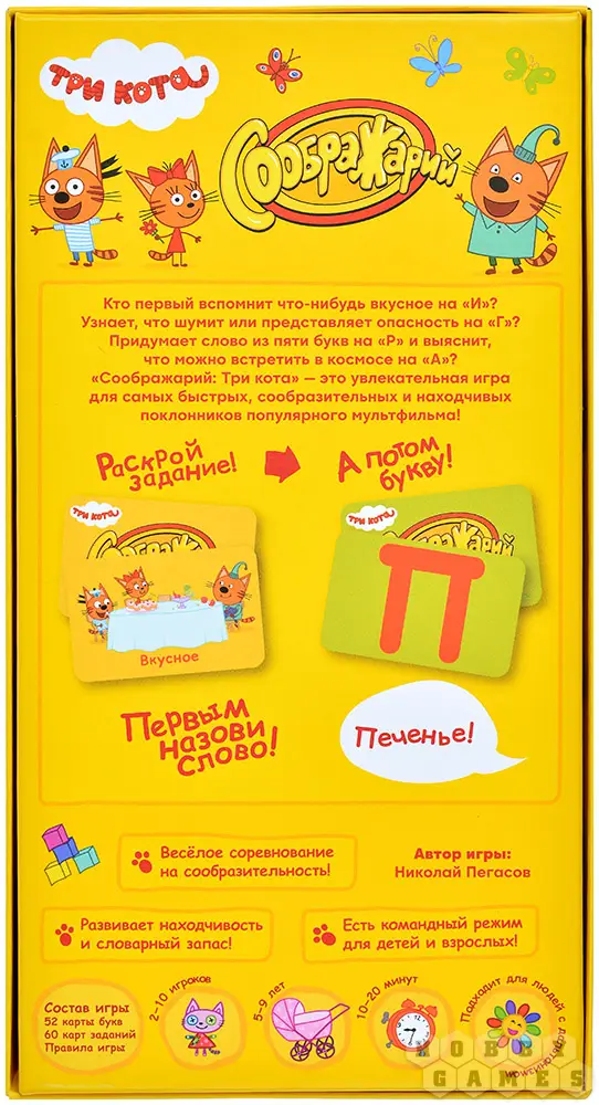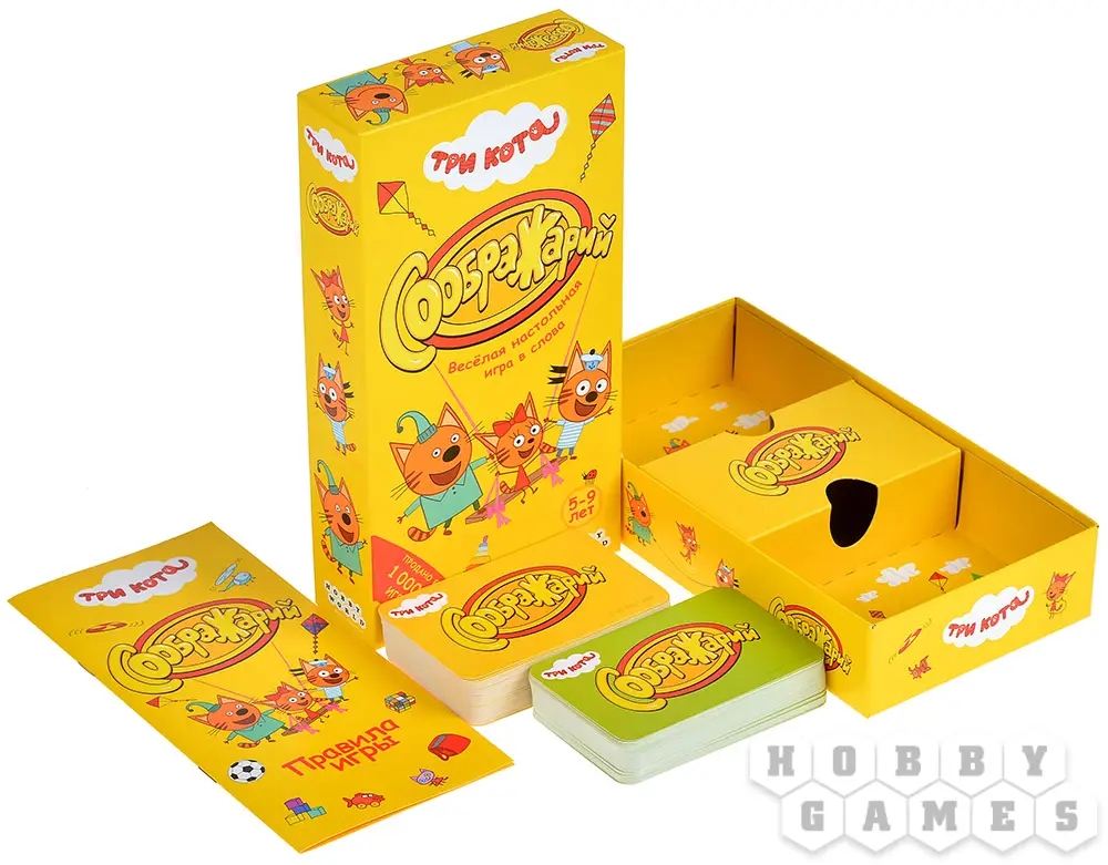 "Соображарий: Три кота" – это весёлая и занимательная игра для компании детей, которые, впрочем, не будут против, если к игре присоединятся и их родители. Придётся как можно быстрее вспоминать различные слова и называть их, да так, чтобы они подходили под определённые условия. Эта настолка придётся по вкусу не только поклонникам одноимённого мультфильма, но и всем-всем-всем!