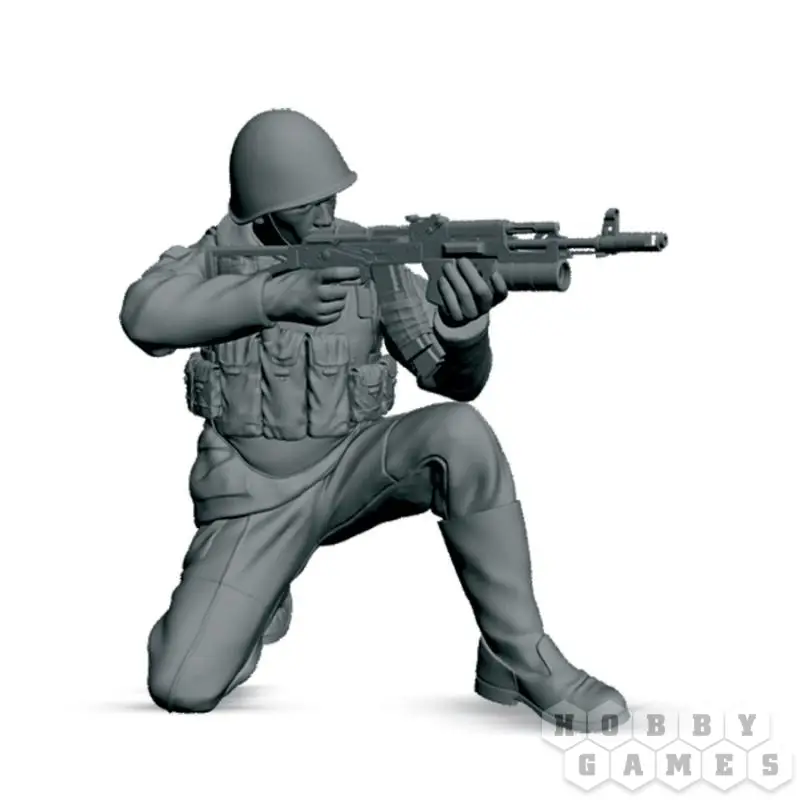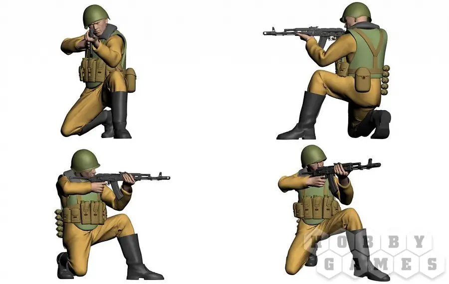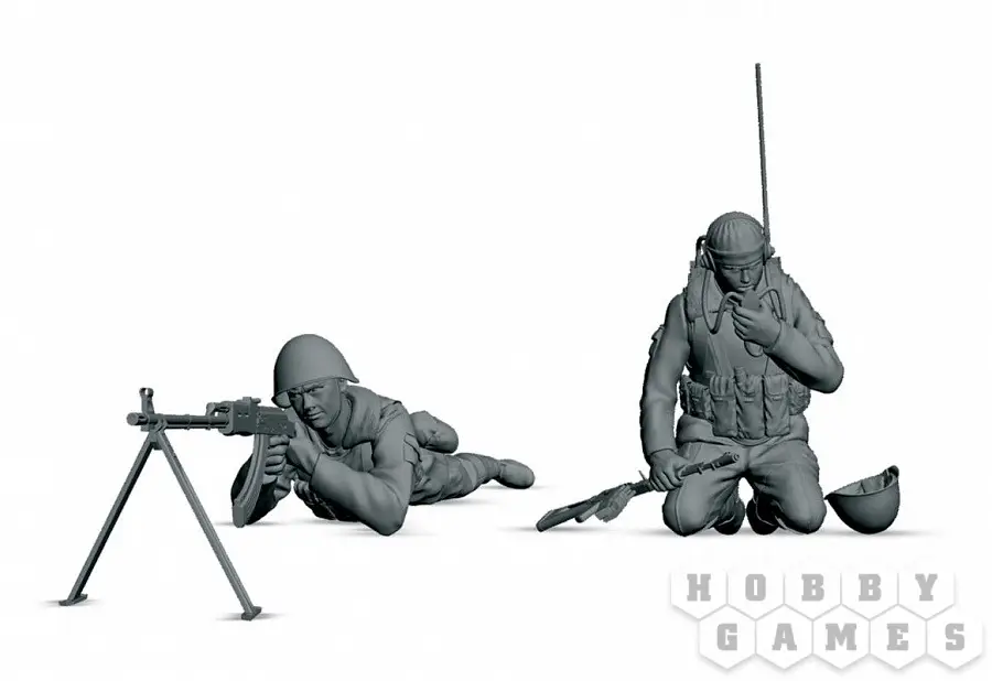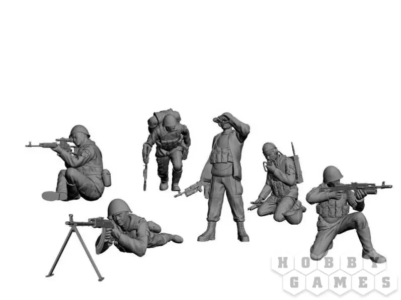 Набор включает 6 фигур советских десантников, изображенных в характерной экипировке для Афганской войны. Каждая фигурка вооружена высокоточными миниатюрами оружия, включая автоматы АК-74, пулемет РПК и снайперскую винтовку Драгунова. Оружие изготовлено с использованием метода высокоточного 3D-моделирования, что позволяет достичь невероятной детализации.