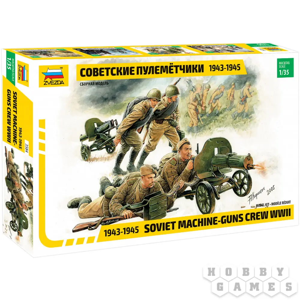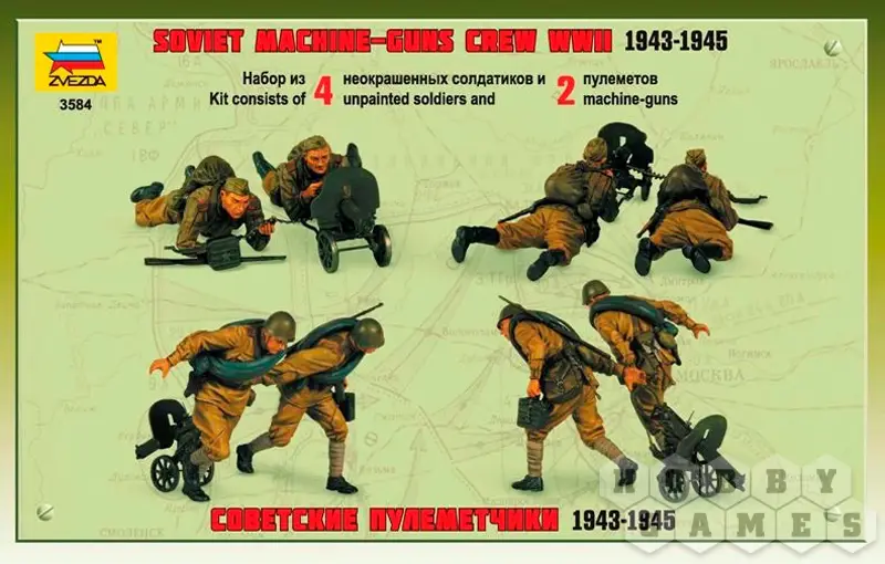 Создайте детализированную композицию с советскими пулемётчиками времён Великой Отечественной войны. Набор содержит две модификации знаменитого станкового пулемёта "Максим" и четыре фигурки солдат, выполняющих роль расчёта, что даёт возможность создать правдоподобную боевую сцену.