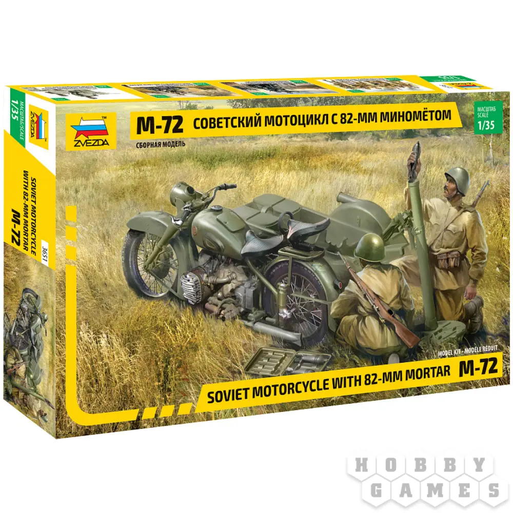 Сборная модель включает детали для создания мотоцикла, 82-мм миномета и двух фигур солдат. Вы можете собрать миномет как часть мотоцикла или отдельно.