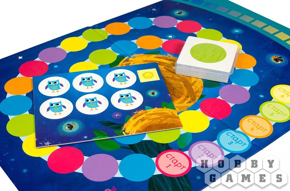 Игровое поле состоит за разноцветных кружков. Каждый ход участники смогут сыграть карту любого цвета. После этого можно передвинуть любую птичку на следующее для неё свободное поле этого цвета, при этом занятые поля нужного цвета совушки пролетают насквозь.