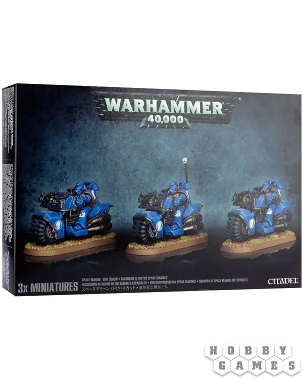 Набор содержит достаточное количество пластиковых деталей, чтобы собрать три миниатюры из Мотоциклетного Отряда Космодесанта. Их можно вооружить двойными болтерами и его уменьшенной версией – болт-пистолетом. В набор также входит Лист Декалей для Отряда Космодесанта.