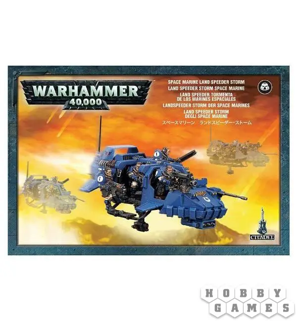В комплекте вы найдёте 99 пластиковых деталей, позволяющих собрать миниатюру Лендспидера "Шторм" и 6 скаутов Космодесанта (Space Marine Scouts). Также здесь есть пусковая установка "Цербер" (Cerberus launcher), тяжёлый болтер (heavy bolter) и несколько опциональных голов, рук и вооружения для скаутов. Ну и, конечно же, не обошлось здесь без арсенала гранат, прицелов, рюкзаков и ножей. Набор включает подставку с ножкой.
