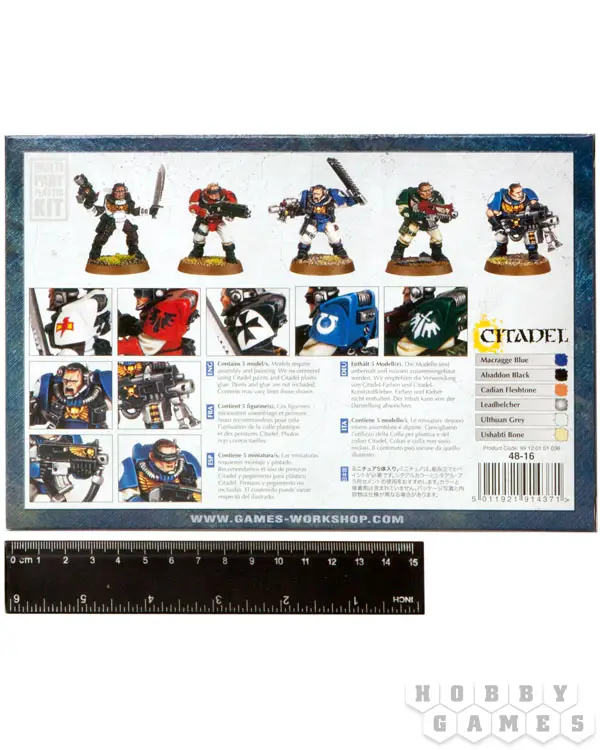 Данный комплект содержит 55 пластиковых деталей, позволяющих собрать отряд из 5 Скаутов Космодесанта (Space Marines Scouts), который включает Сержанта (Sergeant) с вариациями вооружения и четырёх Скаутов, вооружённых болтерами (bolter), болт-пистолетами (bolt pistol), а также рукопашным оружием или дробовиками Астартес (Astartes shotgun). Одну из миниатюр можно по вашему выбору вооружить тяжёлым болтером (heavy bolter). А ещё в комплект входят вариации голов и опциональные аксессуары, включая гранаты. Вы сможете по-настоящему персонализировать свои миниатюры! Набор включает в себя пять 25-миллиметровых подставок и лист декалей Ультрамаринов (Ultramarines).