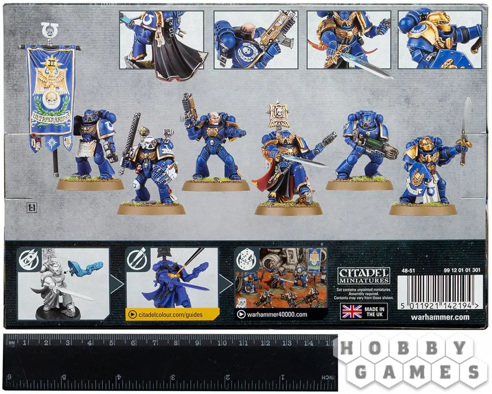 В данном наборе вы найдёте Капитана Космодесанта, вооружённого силовым мечом и плазменным пистолетом, во главе Командного Отряда: пятерых бойцов из числа лучших воинов человечества, включающих в себя Сержанта-Ветерана (Veteran Sergeant), Чемпиона Роты (Company Champion), Апотекария (Apothecary), Знаменосца (Standard Bearer) и Космического десантника со штурмовым орудием. В комплект входят 32-миллиметровые круглые подставки и переводной лист ордена Ультрамаринов (Ultramarines).
