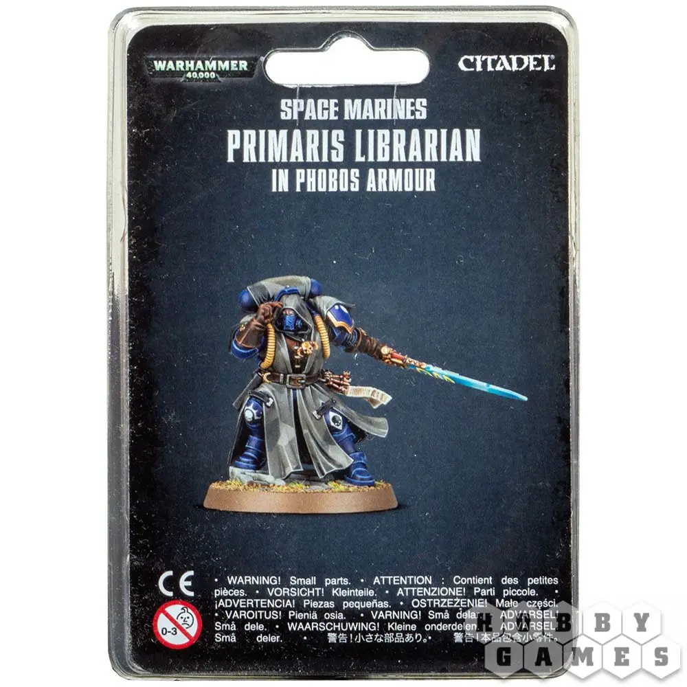 Примарис Библиарий в броне "Фобос" (Primaris Librarian in Phobos Armour) представляет собой командира для Космического Десанта (Space Marines), а также Кровавых Ангелов (Blood Angels), Тёмных Ангелов (Dark Angels) и даже Космических Волков (Space Wolves) вступая за линию фронта в качестве Рунного Жреца (Rune Priest). Он умелый воин и могучий псайкер, который способен взывать к силам из психической дисциплины Затмения. Его голова покрыта психическим капюшоном, который увеличивает его шансы сотворить своё заклинание и отменить заклинание оппонента. Как и многие другие бойцы авангарда, Примарис Библиарий в броне "Фобос" одет в маскхалат, который увеличивает его защиту в укрытии.