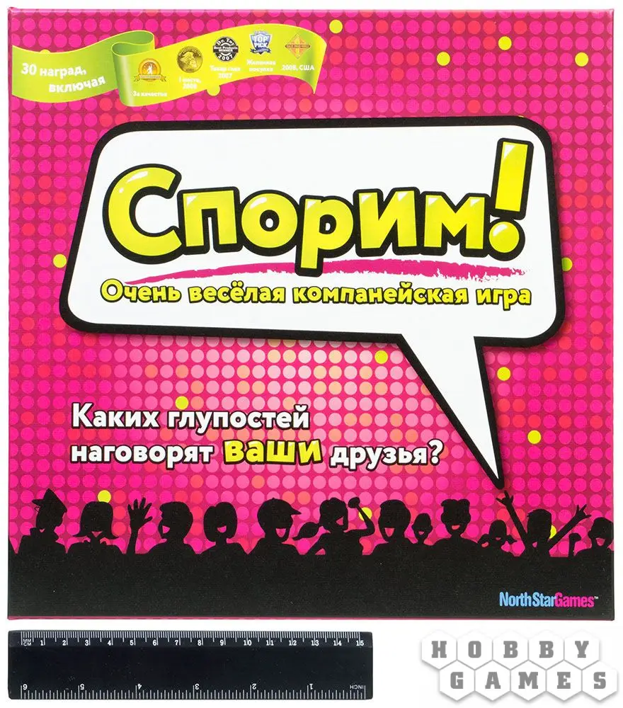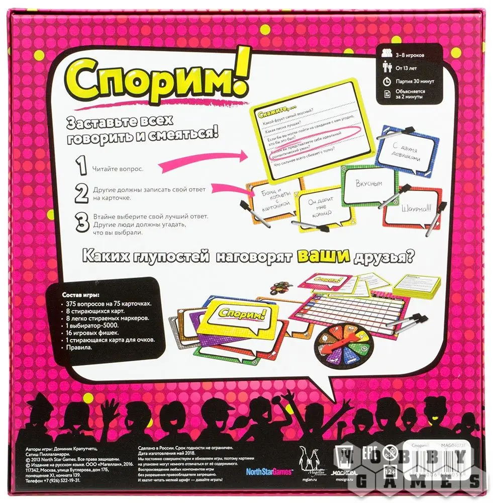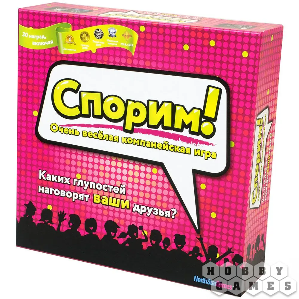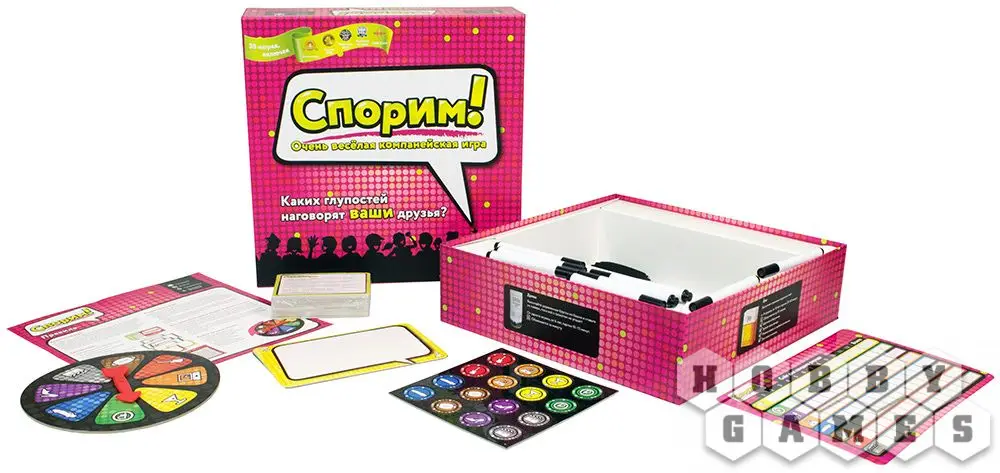 Настольная игра "Спорим!" будет бомбардировать вас неожиданными вопросами. Тем очень много и зазубрить ответы не получится в принципе, так, что готовьтесь импровизировать! Обычно раунд проходит так: ведущий достаёт карточку и зачитывает вопрос, а остальные игроки в тайне пишут ответ. Когда вскроются все ответы, ведущий выберет лучший ответ, а вам надо угадать, что он выбрал, неважно ваш это ответ или чужой, так вы заработаете очки.