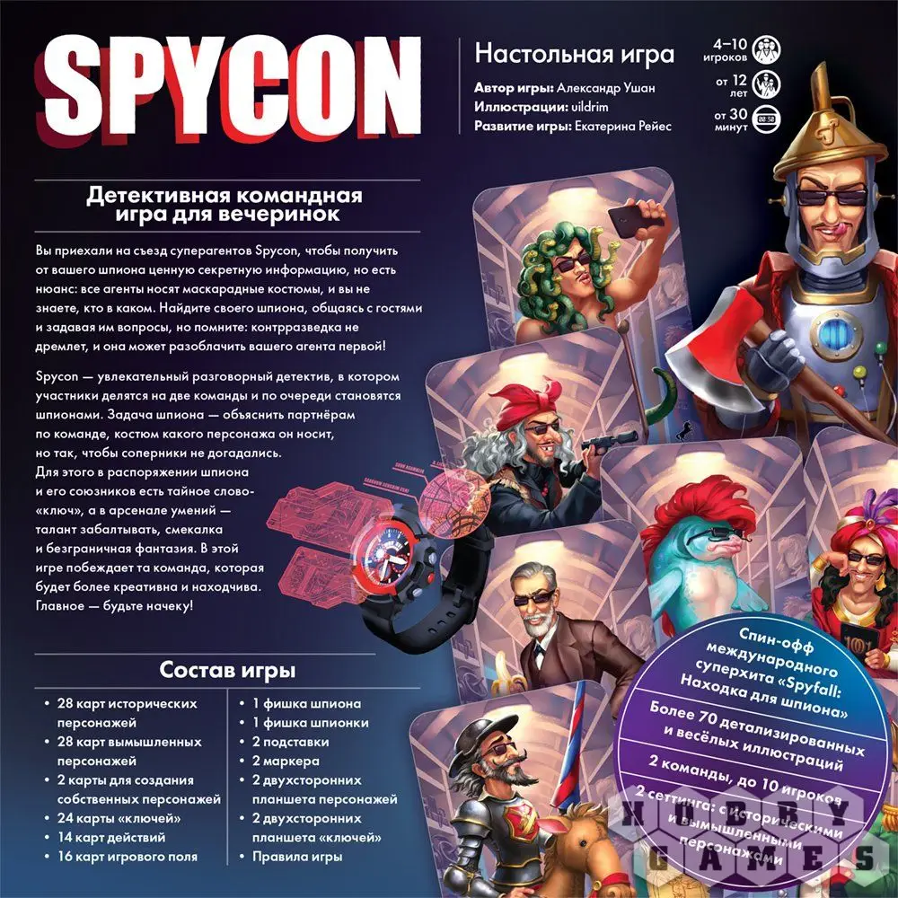 Spycon – это разговорная детективная настольная игра, рассчитанная на противоборство двух команд суперагентов. Игроки по очереди становятся шпионами и каждый пытается объяснить своей команде, в какой именно костюм он облачён. Это нужно делать таким образом, чтобы команда соперников ни о чём не догадалась. Для успешного выполнения этой миссии агенты пользуются тайными словами-ключами, а также проявляют свои таланты шпиона – смекалку, фантазию и артистичность!