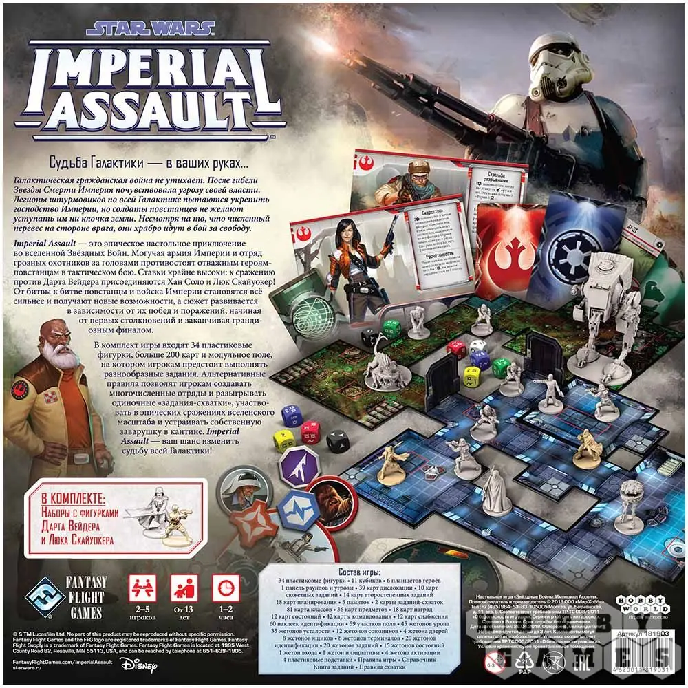 Star Wars: Imperial Assault удивит игроков богатством компонентов. Здесь Вы найдёте 34 пластиковые фигурки, больше 200 карт и модульное поле. Кроме того, в игре есть правила для дуэльного режима "схватка", который позволит вывести на поле многочисленные отряды и разыграть одиночные задания. Вы сможете сразиться в эпическом бою галактических масштабов или устроить драку в кантине. В игре Imperial Assault Вы управляете судьбой Галактики!