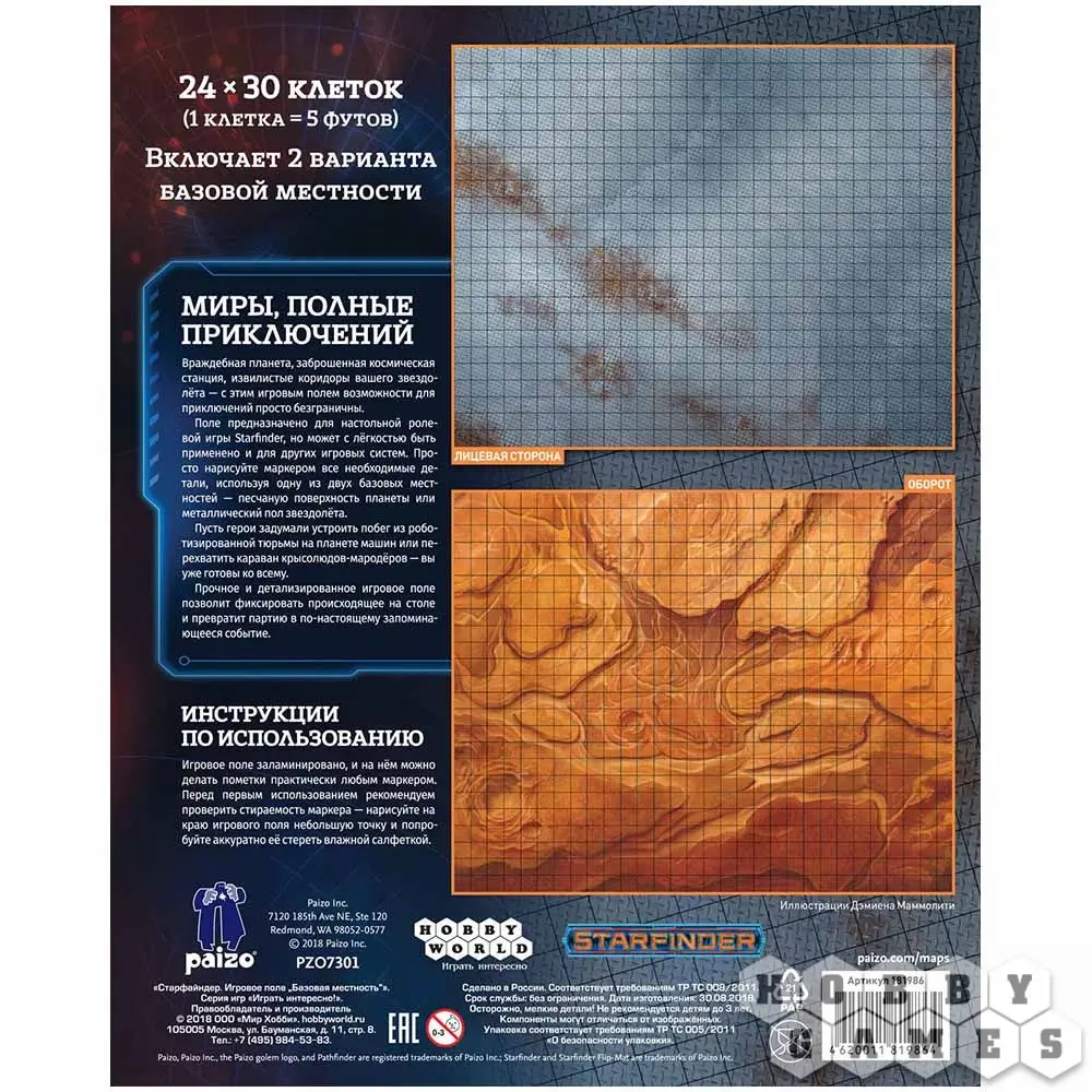 Данное игровое поле можно использовать как в настольной ролевой игре Starfinder, так и в другой игровой системе. Нужно всего лишь обозначить на одной из поверхностей требуемые Вам элементы игры. С одной стороны поля изображена песчаный рельеф какой-то планеты, а с другой – металлическая поверхность, напоминающая пол космического корабля.