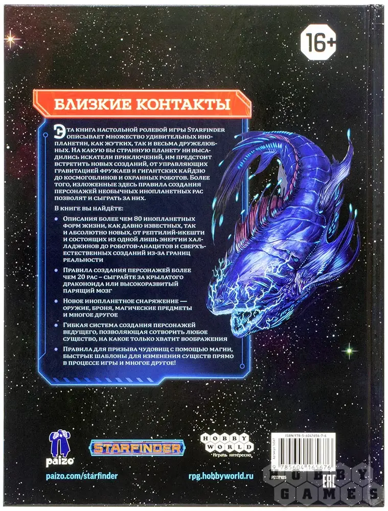 Данная книга предназначена специально для использования с "Starfinder. Настольная ролевая игра", и содержит массу информации о различных инопланетных видах, как дружелюбных, так и внушающих страх от одной лишь мысли оказаться перед ними лицом к лицу. Книга расскажет вам массу интересного! Вы узнаете о расе фружаев, которые умеют манипулировать гравитацией одной лишь силой мысли; о гигантских космических кайдзю; о новаспаунах, способных уничтожать планеты и многих других, не говоря уже о таких простых видах, как космогоблины или охранные роботы.