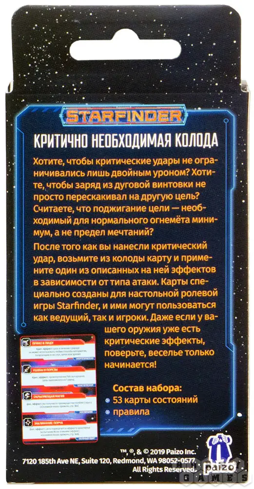Вам надоел банальный двойной урон при критическом попадании? Устали от однообразных боёв в Starfinder и хотите их разнообразить? Тогда колода карт критических ударов именно то, что вам необходимо. Работает она очень просто, сделали критический удар – потянули карту и применяете случайный эффект на противника. Применить можно только один из написанных на карте, подходящий для вашего типа атаки. Карты работают даже на оружие, которое уже обладает критическими эффектами. Бои станут веселей и каждый критический удар станет для вас подарком, которого вы будете ждать снова и снова. Всего в колоде 212 эффектов, по 4 на каждой карте.