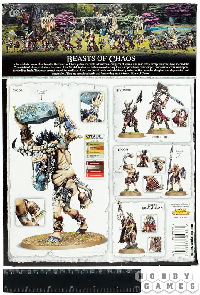 Набор станет отличным стартером для армии Зверей Хаоса в партиях Warhammer Age of Sigmar. В комплекте: Великий Рёв-Шаман (Great Bray-shaman), Сайгор (Cygor), может быть собран в качестве Гхоргона (Ghorgon), 10 Ангоров (Ungors), могут быть собраны в качестве Ангоров-Налётчиков (Ungor Raiders), 10 Зверогоров (Bestigors), а также правила Warscroll Battalion, необходимые для игры.