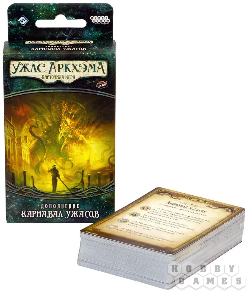 Венецианские каналы и карнавалы манят к себе миллионы людей, но за причудливыми масками и костюмами на этот раз скрывается истинный ужас… Пока гости наслаждаются романтикой Венеции и бродят по улицам, "замаскированные" адепты и культисты продолжают своё тайное дело. Тени окутывают город, а из лагуны поднимается нечто невероятно кошмарное… "Ужас Аркхэма. Карточная игра: Карнавал ужасов" – это дополнение, предлагающее игрокам шестьдесят две новые карты и независимый сценарий, действие которого происходит в Венеции, городе тайн и масок. При желании данный сценарий можно включить в вашу основную сюжетную историю.