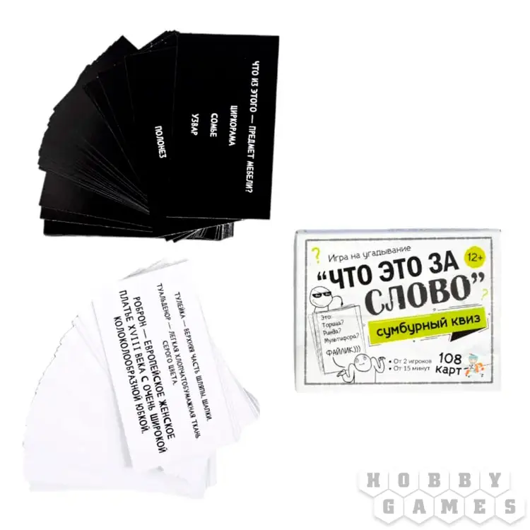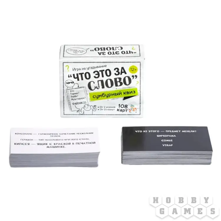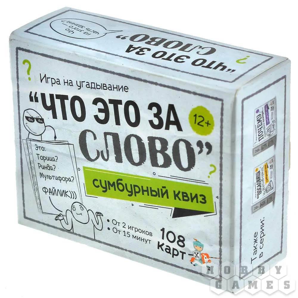 Игра "Что это за слово" – настоящая кладезь таких словесных редкостей, к которым вы, вполне возможно, и не собирались никогда обращаться. Что такое "раменье"? А "узвар"? Это предстоит угадывать вам... Вы будете по очереди тянуть карточки, на каждой из которых написан вопрос общего характера и приведены три слова. Ваша задача – выбрать верный ответ. Проверить себя просто: переверните карту и огласите написанное на обороте. Если вы угадали, заберите её себе. Настоящим эрудитом станет тот, кто к концу приобретёт самую толстую колоду с честно отгаданными словами! А самое приятное, побороться за это звание можно как вдвоём с другом, так и в большой компании!